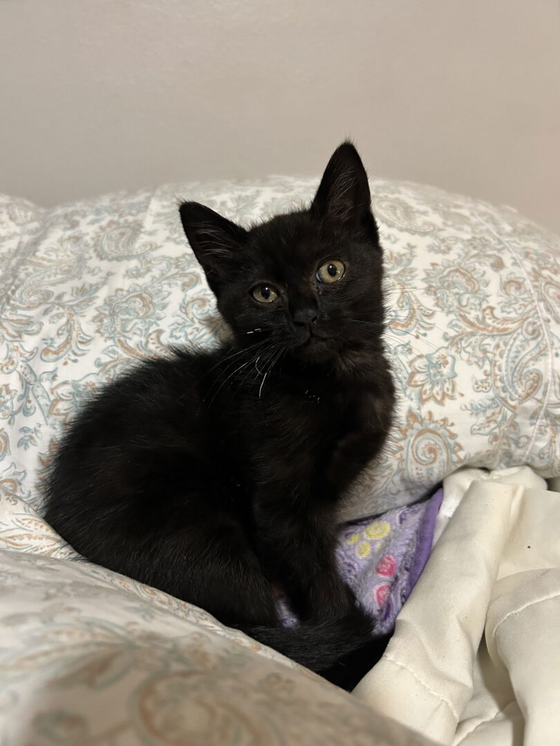 See Knightly’s HomepageGo to our official websitePlease contact Kristy (barth.kristy@gmail.com) for more information about this pet.Knightly is mostly black with white under chin, as well as some stripes faintly showing through. Very playful, sweetest chirp when reminding humans it’s meal time!! ADOPTION FEE: $50.00**Another kitten is included in fee if adopted on same day** INCLUDED: Neuter or Spay surgery, initial vaccinations, microchip and Feline Leuk/FIV testing. Rabies is included but will need to be completed when I get a little bigger. QUESTIONS and/or to MEET ME: please email my foster mama @barth.kristy@gmail.com AND please include a little about my new home(i.e. who will I live with, will I have any pet or human siblings??)