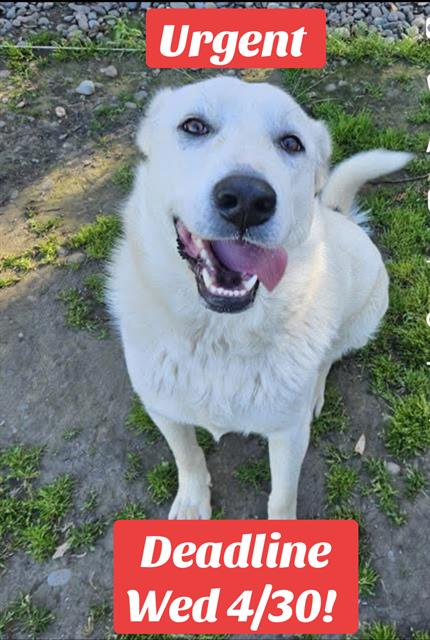 !!URGENT- DEADLINE FOR ADOPTION OR RESCUE: WEDNESDAY 4/30!!Meet Kookie — a stunning 7-year-old Great Pyrenees mix with an independent spirit. True to her breed, Kookie seems to have spent her early years doing what Pyrenees were born to do: living outdoors, protecting her flock, and relying on her instincts. She came into the shelter in rough shape, loaded with parasites, likely a sign of a hard-working life on her own. Kookie is now ready for her next chapter. At 7, she’s well past the puppy antics stage — she appreciates calm, predictable routines and a quiet home where she can feel secure. The noisy, stressful shelter environment has made her unsure and defensive around other dogs, which isn’t unusual for her breed in these conditions.Kookie will thrive in a home that understands and respects the independent, guardian nature of livestock guardian breeds. She’s not a dog park socialite — she’s a thoughtful, loyal companion who bonds deeply with her people. If you have a peaceful home, a secure yard, and the patience to let her settle in at her own pace, Kookie just might be your perfect match.Breed-savvy adopters preferred. Kookie deserves a home where her heart and instincts are honored.To meet me, visit the Bradshaw Animal Shelter Tuesday-Sunday, Noon – 5:00 pm, Wednesdays, Noon – 6:00 pm. All adoptions are on a first-come, first-served basis. To help expedite the meet and greet process, please make note of my Animal ID number, and those of other dogs you might be interested in meeting. Be sure to bring your ID with you, too. We are located at 3839 Bradshaw Road, Sacramento. I look forward to getting to know you!