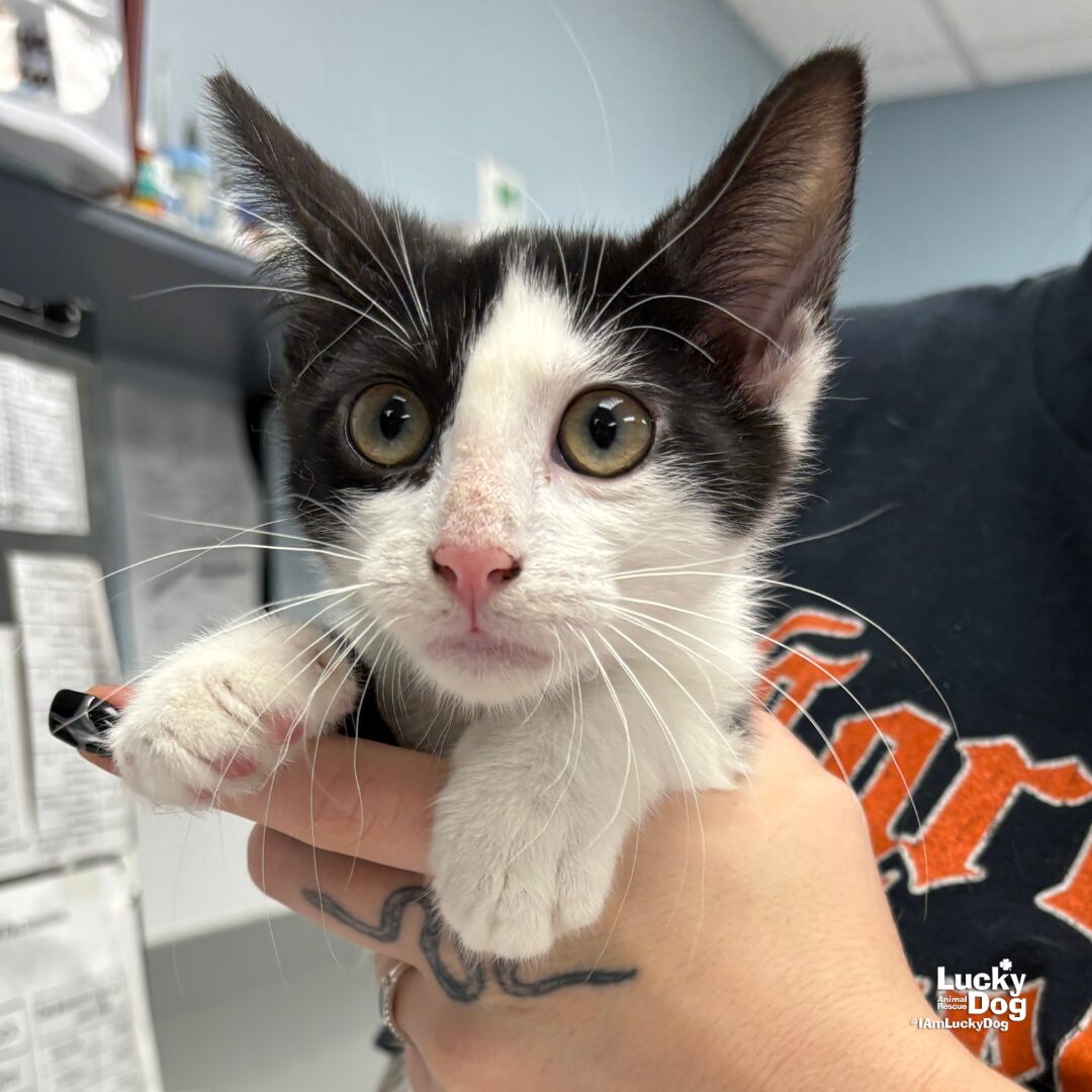 Please contact Mollie Gorney (mollieg@luckydoganimalrescue.org) for more information about this pet.Cute guy ISO his forever family!LANGLEY NEEDS A FOREVER HOME! COME MEET LANGLEY AND OTHER GREAT ADOPTABLE CATS ON SUNDAY 6/15 FROM 12PM-3PM AT THE PETSMART IN FALLS CHURCH (6100 ARLINGTON BLVD, FALLS CHURCH, VA)! Name: Langley Best Guess for Breed: Domestic Short Hair Age: 14 weeks as of 6/9 DOB: 3/3/25 SEX: Male Approximate Weight: 3lbs 9oz Coloring: Black and White Type of Hair: Short Gets Along With: With proper integration, Langley will likely get along with other cats, dogs and kids with an acclimation period. We’re happy to help with tips and tricks! Currently Living at: Shelter — Coming to the DC Area Soon! Litter: Larrie I am Looking For: My loving forever family! Hi! I’m Langley, and I am a cute little kitty! I won’t ask for much- just some love, cuddles and lots of toys so I can run and play and be my kitty self. What My Foster Says About Me: Coming Soon! TO ADOPT: The adoption fee for adult cats is $200 ($350 for two cats adopted together). The adoption fee for a kitten (under 7 months old) is $220 ($380 for two kittens adopted together).If you are interested in adopting, please complete the Adoption Questionnaire online at bit.ly/adoptaluckycat. Lucky Dog Animal Rescue does our best to provide accurate information about the cats we have for adoption. That said, we cannot make any guarantees about age, breed or temperament. Thank you for contacting Lucky Dog Animal Rescue and helping to save a life! Please visit us online at www.luckydoganimalrescue.org . BE A FOSTER!!! Fosters make it possible for Lucky Dog Animal Rescue to save and care for homeless and abandoned dogs! To learn about fostering, please contact fostering@luckydoganimalrescue.org BE A SPONSOR!!!! Sponsors help Lucky Dog support the many dogs we save. To learn more about sponsorship, please contact info@luckydoganimalrescue.org !