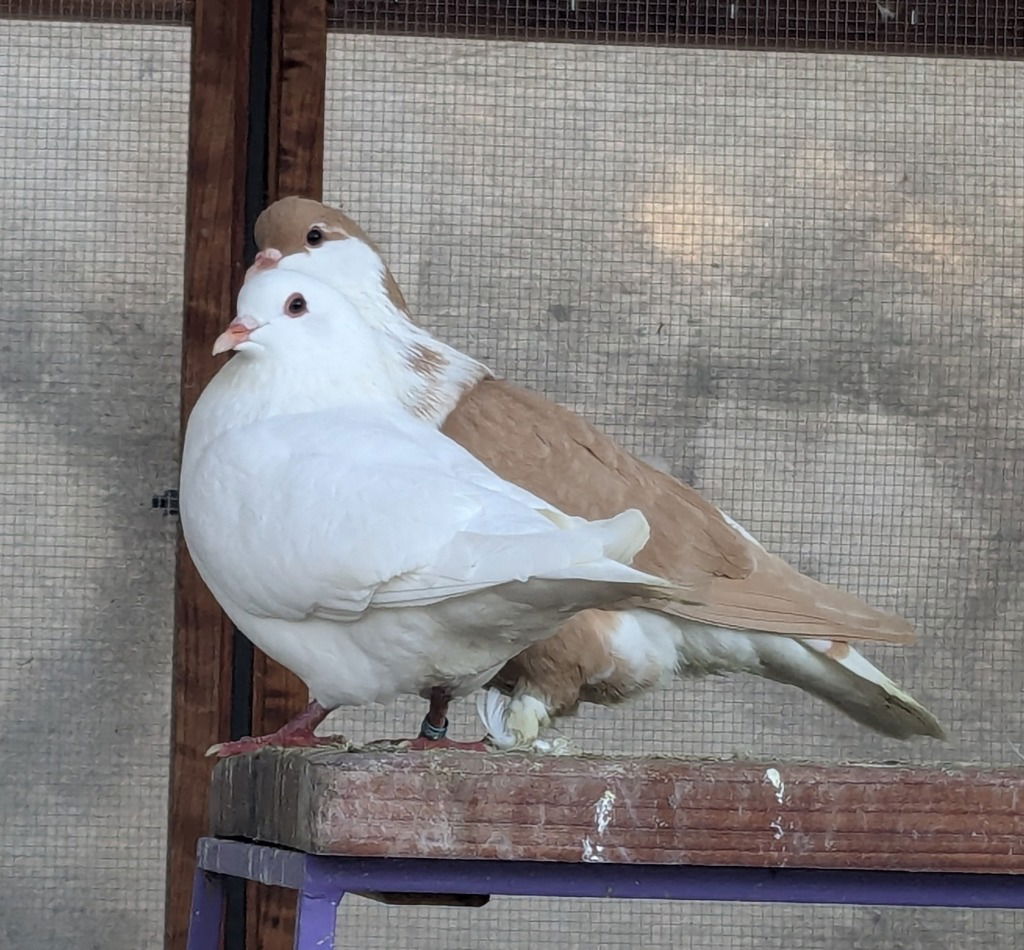 Meet Latte! Latte is a big, gentle, puffy, curious, quiet, soft cutie patootie that was lucky to make it into the hands of someone familiar with Palomacy when she showed up lost, hungry, and alone in a neighborhood. In her foster home, she is friendly with the other pigeons and doesn’t mind hanging out with humans. It was a matter of days before a perfectly symmetrical king pigeon named Bumper wooed her. They are now enjoying a safe life together in a foster aviary. They will likely do well in either an outdoor aviary or an indoor home that wants to spoil and love them both.Please apply to adopt http://www.pigeonrescue.org/birds/apply-to-foster-or-adopt/