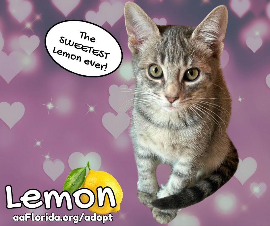 See Lemon’s HomepageGo to our official websitePlease consider sponsoring a cat. For a little as $10 a month you can help us help more animals in need.My name is Lemon and I'm looking for my fur-ever home! My cat mama needed some help taking care of my two siblings and I, so a nice human has been our second mama. I'm super sweet and calm, I love to hang out and snuggle up to my kitty friends and to people. Our adoption fees are $75.00 for any kitty 6 months of age or older. $85 for kittens under 6 months of age. Included in each adoption: age appropriate shots, microchip, and spay/neuter surgery. All kitties are litterbox trained. Prior to meeting or adopting any of our wonderful kitties, we ask that you please fill out our online Cat Adoption Application on our website aaFlorida.org/adopt. There is a link on the top of the home page. Click on "Fill in", you don't have to register. For more information about this kitty or any others, you can contact us at Adoptions@aaFlorida.org. We are a foster organization and don't have set hours we are open – but we will gladly set up an appointment for you to meet any cat. Of course, you're under no obligation to adopt if you come to meet any of our fabulous felines.