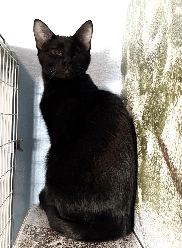 Hi my name is Le Sabre. I have sleek black fur and 1 eye. I was rescued down in El Paso TX with my brothers, and we all had bad eye infections. Wild Blue brought us north, and gave us treatments for our eye troubles. My eye was the worst of all and though the vet tried different procedures to help me keep it, eventually it was decided that removing my left eye was best for me. My brothers are all in their forever homes now, but due to my different surgeries, I'm still looking for my family. I've also had some emotional trauma from the many weeks of trying different treatments, and eventually having the final surgery. I'm healed well now, but need to learn to be social with people again. I'm a good girl, and need some patience. I would do best in a home with older children or no children. I would probably do well in a home with other cats and maybe even dogs as long as you follow the introduction procedures provided by Wild Blue Cats. Please note: kittens may NOT be adopted as a Barn Cat nor be outdoors unsupervised as they are too young to know how to protect themselves.