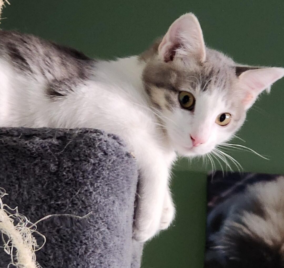 Lily is a purring sweetheart. Loves cuddling and making biscuits. She will climb to the top of the tallest level on the cat tree. Plays with other kittens and adult cats. Use to being around small dogs, including a 7lbs puppy who like to swallow her head. Raised in a home with a single adult so unknown her comfort level with children. Lily is tested, spayed, vaccinated, and micro-chipped. Her estimated birth date is 7/1/2025 and her adoption fee is $180.