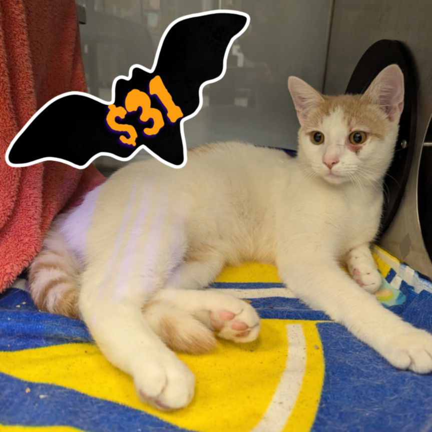 Linus is a beautiful white cat with spots of Orange Tabby. He would be a fantastic addition to another home with a very playful cat or kitten. Linus enjoys spending time out of his kennel here at the shelter, and has been given some time to stretch his long legs. Linus will need higher-than-average mental and physical stimulation in his next home, and would thrive with a cat-savvy adopter. Linus is neutered, and ready to go home same day! From October 24th to October 27th, join us for our Spooktacular Adoption Special! During this time, all dogs, cats, and rabbits can be adopted for a frightfully low fee of just $31!Please note: Our Santa Cruz location’s Shelter hours are 11-6pm, 7 days a week! Although clients can walk through and see any animals in their kennels during open hours, we end “meet and greets” (aka meeting an animal out of the kennel) at 4:30pm every day. If you’d like to meet an animal out of the kennel, please arrive before 4:00pm to allow for time to discuss individual animals and meet them.