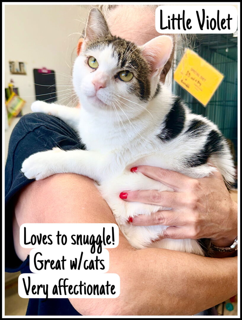 Little Violet – Petite Sweetheart with a Big Heart! Little Violet is a petite kitty with a chubby belly and a beautiful white coat covered in big brown/black spots. She’s about 2 years old and has an incredibly loving personality, and a very loud purr. Violet adores people and purrs easily—she especially loves being picked up and snuggled. Violet likely experienced a car accident in the past, which left her with a limp in her back leg. The injury has healed, but the limp will probably be permanent. Thankfully, it doesn’t slow her down much! She still loves to play and can even jump up onto the couch at her foster mom’s house. She gets along wonderfully with other cats and would thrive in a calm home. Because she prefers a quieter environment, Violet would do best in a home without young children or dogs. Violet is full of love and ready to find a home where she can snuggle, play, and be cherished. Please submit a no-obligation application for a meet and greet to adopt today: https://forgottencats.org/adoption-application/. Not ready to adopt? Please consider fostering: https://forgottencats.org/foster-a-cat/. Thank you! (Foster: Willow Grove)
