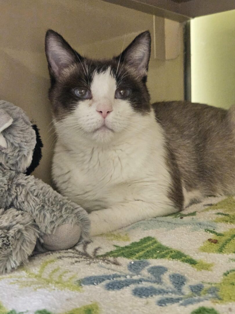 Lizzy – Female DOB 8/12/2022 Domestic Short Hair – Siamese Lizzy is a sweet, shy two-year-old learning to trust and feel safe. After raising four kittens, she’s ready to find a forever home of her own. Lizzy purrs instantly when petted and absolutely loves chin rubs, though she’s still a bit nervous about being picked up. She’s currently in a quiet room where she’s slowly gaining confidence and discovering that human attention can be a wonderful thing. Lizzy is very affectionate but needs time and patience to adjust to her surroundings. She often seeks comfort with her little stuffed kitty and would do best with a gentle, friendly cat companion to help her feel at ease. Due to her shy nature, Lizzy would do best in a calm, kid-free home without dogs. Please apply via our easy online application at https://furrr.org/cat-adoption-process/All kitten(s) and cat(s) at FuRRR Feline Rescue are spayed/neutered, up to date on vaccinations for their age, combo tested for FIV/FeLV, microchipped and have a Health Certificate from a licensed NH veterinarian. Our application is available to be completed online at https://furrr.org/cat-adoption-process/ Applying DOES NOT guarantee approval. We hold meet and greets with approved applications only. (Kittens are available for adoption in pairs only unless they are going home to another kitten or young cat under 3) Our policy is strictly NO DECLAWING and INDOOR ONLY. Adoption fees: Kitten to 1 yr – $300 Kitten pairs $550 Adult cat 1+ yr to 8 yr – $200 Adult pairs $350 Cat 8+ – $75
