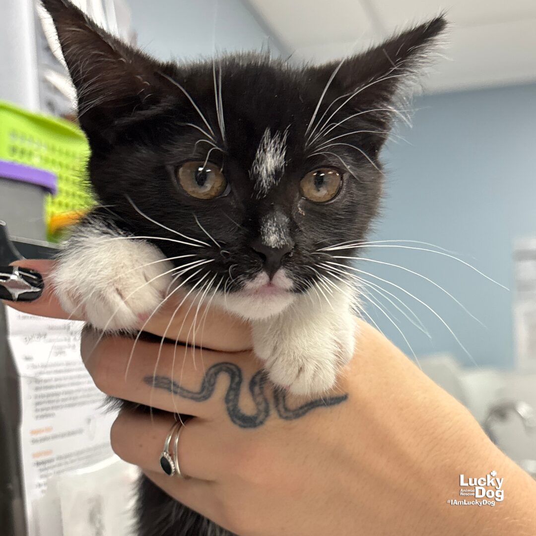 Please contact Mollie Gorney (mollieg@luckydoganimalrescue.org) for more information about this pet.Cute Girl ISO her forever family!LOTTIE NEEDS A FOREVER HOME! COME MEET LOTTIE AND OTHER GREAT ADOPTABLE CATS ON SUNDAY 6/15 FROM 12PM-3PM AT THE PETSMART IN FALLS CHURCH (6100 ARLINGTON BLVD, FALLS CHURCH, VA)! Name: Lottie Best Guess for Breed: Domestic Short Hair Age: 12 weeks as of 6/9 DOB: 3/17/25 SEX: Male Approximate Weight: 2lbs 4oz Coloring: Tuxedo Type of Hair: Short Gets Along With: With proper integration, Lottie will likely get along with other cats, dogs and kids with an acclimation period. We’re happy to help with tips and tricks! Currently Living at: Shelter — Coming to the DC Area Soon! Litter: Leonard, Lidl, Locus I am Looking For: My loving forever family! Hi! I’m Lottie, and I am a cute little kitty! I won’t ask for much- just some love, cuddles and lots of toys so I can run and play and be my kitty self. What My Foster Says About Me: Coming Soon! TO ADOPT: The adoption fee for adult cats is $200 ($350 for two cats adopted together). The adoption fee for a kitten (under 7 months old) is $220 ($380 for two kittens adopted together).If you are interested in adopting, please complete the Adoption Questionnaire online at bit.ly/adoptaluckycat. Lucky Dog Animal Rescue does our best to provide accurate information about the cats we have for adoption. That said, we cannot make any guarantees about age, breed or temperament. Thank you for contacting Lucky Dog Animal Rescue and helping to save a life! Please visit us online at www.luckydoganimalrescue.org . BE A FOSTER!!! Fosters make it possible for Lucky Dog Animal Rescue to save and care for homeless and abandoned dogs! To learn about fostering, please contact fostering@luckydoganimalrescue.org BE A SPONSOR!!!! Sponsors help Lucky Dog support the many dogs we save. To learn more about sponsorship, please contact info@luckydoganimalrescue.org !