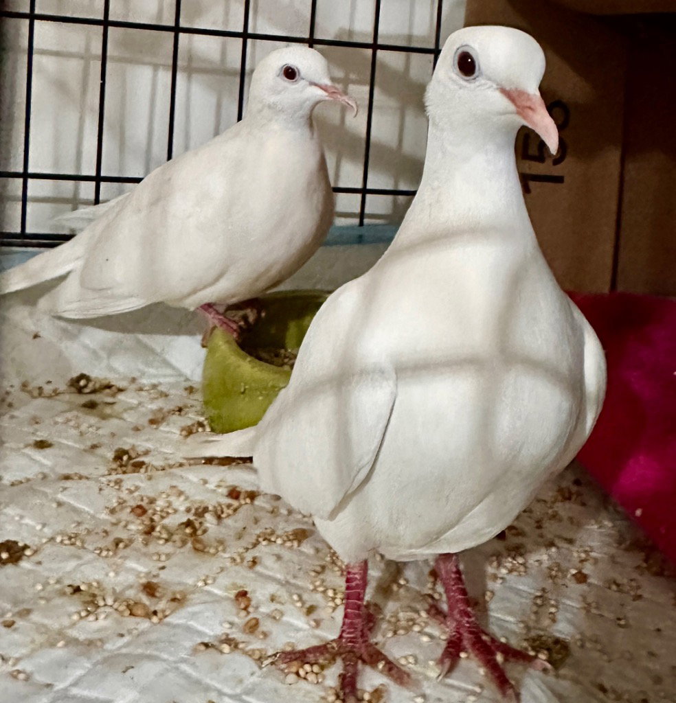 These are two hens who are mated. They are sweet and quiet and love each other and are pretty people friendly, too. Because they are both female, they do not coo often. They enjoy snuggling with each other, bathing, napping in the sun, and building nests.Please apply to adopt http://www.pigeonrescue.org/birds/apply-to-foster-or-adopt/