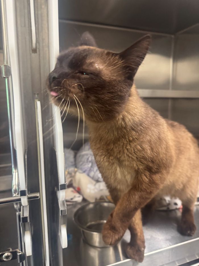 Meet Lou Wang, our four‑year‑old chocolate point Siamese mix with the most breathtaking blue eyes. His tiny tongue is always peeking out, giving him the cutest, goofiest look every single day. He’s unbelievably affectionate—he’ll happily be carried around or climb onto your shoulder like a little velcro kitty the moment you let him.