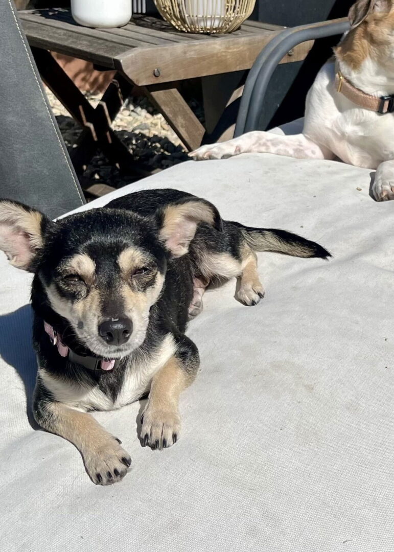 See Louise’s HomepageGo to our official websiteYou can fill out an adoption application online on our official website.Check Me out ! Louise came to us from a high kill shelter with a leg fracture that is now fully healed. Louise is a chill girly. She enjoys sunbathing with her foster siblings and taking strolls in her doggy stroller. She is sweet and cuddly. She is sensitive on her back leg due to the previous injury but that does not slow her down. She sleeps through the night and is fully house trained. She gets along with dogs of all sizes but hasn’t been tested in kids or cats.