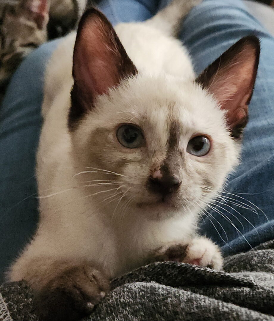 Lucky is an adorable, chatterbox, part Siamese , playful lover girl! Lucky is a sweetheart with unusual markings who loves her share of attention, often by napping on her human's lap, getting lots of pets and sharing her day with you! When she isn't cuddling with a human buddy, you can usually find her wrestling with a foster kitty friend, playing with small catnip snuffies or playing in her favorite cat tunnel(wrestling and batting at the other kitties ouside)!Lucky would thrive in a quieter household, where she can have the peace and comfort she deserves. While she is sensitive to new things and loud noises, older children are more suitable companions for her. Lucky would need to be in a home with another kitten or young cat for play and companionship. She loves to play with the kitties in her foster home. Her foster brother, Iggy would make a great companion for her! **Pet Compatibility:** If you're looking for a cuddly lap cat, Lucky fits the bill perfectly. She enjoys being close to her humans, offering endless love and affection.For more information on Lucky or if you're interested in providing her with a forever home, please feel free to reach out. Lucky is eagerly awaiting to bring joy and warmth to her new family! "WE DO NOT HAVE A PHYSICAL LOCATION AS WE ARE A FOSTER-BASED ORGANIZATION. PLEASE SUBMIT AN APPLICATION TO BE IMMEDIATELY CONNECTED TO A SCREENER.Apply at online application (catsfff.org/adopt)View all of our adoptable cats here (catsfff.org/cats)Our adoption fees are listed here (catsfff.org/adoption-fees)
