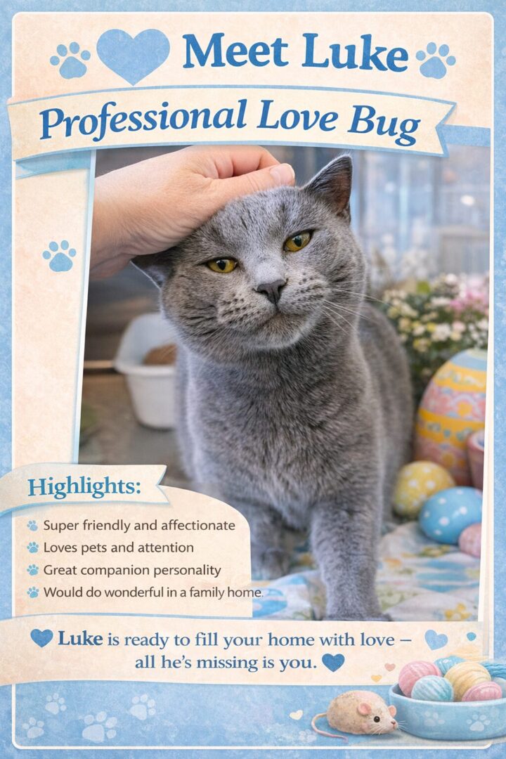 Meet Luke – Your New Best Friend ! Luke is the kind of cat who makes you feel special the moment you meet him. This handsome gray boy is incredibly friendly and affectionate, always ready to soak up attention and shower you with love in return. He absolutely lives for pets and will happily lean into your hand, asking for more. Luke is the definition of a companion cat — he wants to be where you are, whether that’s relaxing on the couch, following you around the house, or greeting you at the door after a long day. With his sweet personality and gentle nature, Luke would thrive in a loving home with a family who will give him all the attention he deserves. He’s ready to trade in shelter life for cozy naps, daily cuddles, and a forever family to call his own. Luke is just under a year old and LOVES other cats. Highlights: •Super friendly and affectionate. •Loves pets and attention. •Great companion personality. •Would do wonderful in a family home. Luke is ready to fill your home with love — all he’s missing is you. Please submit our no-obligation Adoption Application for a meet and greet or to adopt: https://forgottencats.org/adoption-application/. Not ready to adopt? Please consider fostering: https://forgottencats.org/foster-a-cat/. Thank you! (Foster: Trainer)
