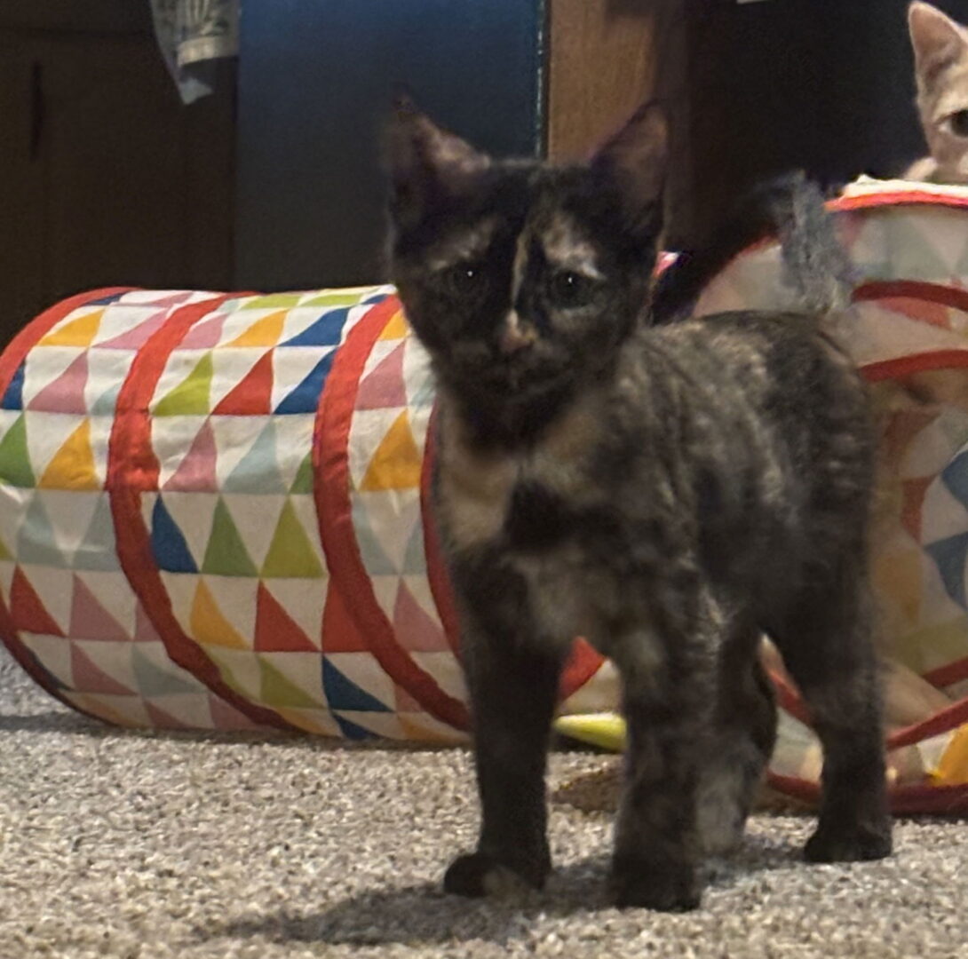See Luna’s HomepageGo to our official websiteYou can fill out an adoption application online on our official website.Please contact Thomas (Tom06661@live.com) for more information about this pet.This pretty black and orange colored kitty is our Luna girl. She is a domestic short hair Black and Orange calico. She is a super sweet girl; she is the sister of Draco and Cosmo who are also available for adoption. Luna is the most vocal of the 3. She is very talkative and is not afraid to tell you when she wants pets and tell you until you give her pets and attention. She loves being a lap boy and laying in your lap and being nuzzled, sometimes she will not stop meowing until she gets what she wants. She loves to play with her brothers and is good with other cats. Luna is highly active and loves hanging toys and chasing toys. Luna is a little shy when it comes to new people, but it does not take her long to open up and become a little purr box. Luna would thrive in a home with one or both of her siblings, another playful cat, or a cat friendly active dog. Luna is set to be spayed on 3/14/25 and will be available for adoption shortly after that. If you are looking for a sweet, majestic kitten girl to add to your family Luna and/or her siblings could be exactly who you are looking for! If you are interested in adopting Luna and/or any of his siblings please submit an adoption application on our website.