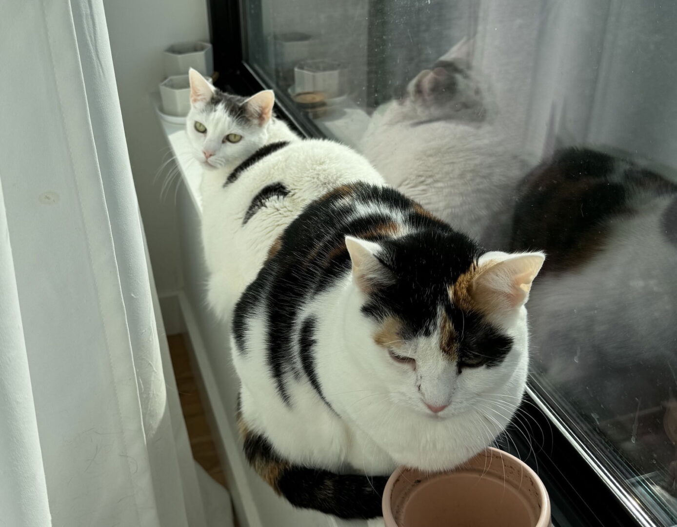 Introducing sweet Luna and Logan! These two lovely siblings lost their home recently when their owner was forced to give them up. They were rescued together as kittens from a backyard in Brooklyn and have been together ever since! They are currently adjusting and relaxing in a warm and safe temporary home with a loving foster mom. Luna is the sweet calico girl. She's a gentle, shy soul who thrives in small, warm places. When she's relaxed in a spot where she feels safe, she enjoys being petted and soaking up some affection. She especially loves to spend her time snuggling with Logan or her foster sister in various sunny spots around the house. Logan is the big white boy with gray spots. He is the braver of the two and responds very well to treats, especially when he is in his favorite place — basking in the sun on the windowsill. With patience, his curious side emerges and he loves to explore the house and investigate things. He also enjoys his scratching pad and sometimes playing with a wand toy. He especially likes the bell it comes with! These two are such a sweet, loving, gentle pair and they are ready to spend the rest of their lives together in a loving furrever home. Luna and Logan are both about 8-9 years old. They are healthy, spayed/neutered, microchipped, up to date on vaccines and have tested negative for FIV/FeLV. They are healthy and ready for a wonderful furrever home with a patient adopter who will give them time to adjust. If you're interested in adopting this darling duo, please go to our application here: https://brooklynanimalaction.org/adoption-forms/. Make sure you mention Luna and Logan, then identify CLAIRE as the rescuer and fill out the form! Thank you for thinking of a rescued angel! Every dime goes to saving the next sweetie on the street.