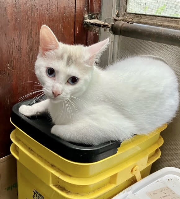 Siamese Manx mix girl.Born 6/6/2023, Maddie is a white Manx mix girl. She has blue eyes, and can hear, she isn’t deaf. She was born to some feral cats in the sunroom of a house so has lived her whole life indoors. She is used to living with other cats and kittens. She likes to play, and if given time to get comfortable with new people she’ll come up to be petted around the head and neck. She does not like to be restrained or picked up. She is up to date on vaccinations, wormed, and has been treated for fleas. She is spayed, combo tested negative for FIV, FeLV, and heartworms and has been microchipped. Her adoption fee is $95 More photos and video at https://photos.app.goo.gl/TzBBbj3Ggyu3Q6b88