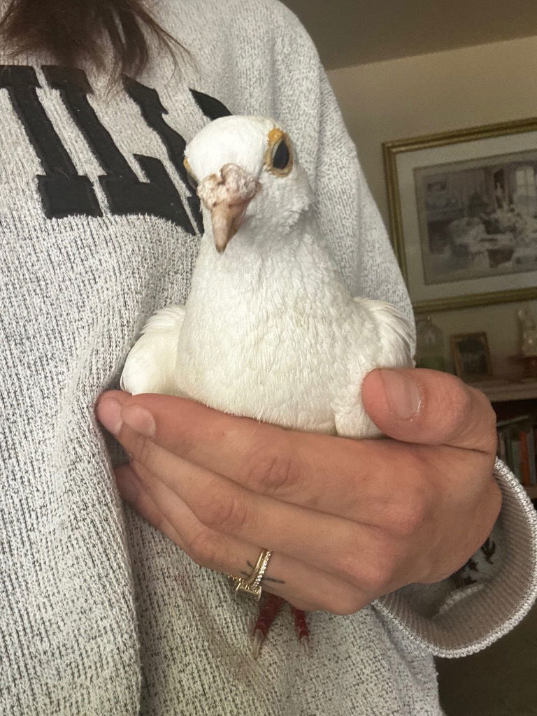 Hi! My name is Maddy and I’m a rock star! I am a homing pigeon and a lucky survivor and was rescued by some kind women after I was found struggling at a popular hiking park. I’m not too certain about being handled yet, but when I’m back to 100% I am going to be the best pigeon ever.Please apply to adopt http://www.pigeonrescue.org/birds/apply-to-foster-or-adopt/