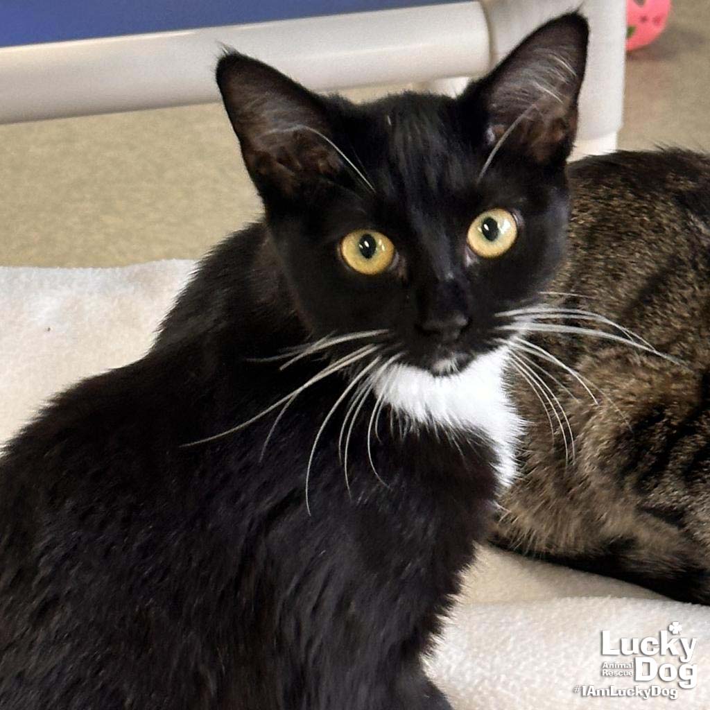 Please contact Lauren McCarty (laurenmc@luckydoganimalrescue.org) for more information about this pet.Posh girl — looking for her forever family!MALAGUETA NEEDS A FOREVER HOME! Name: Malagueta Best Guess for Breed: Domestic Short Hair Age: 6 months a/o 11/25 – Estimated DOB: 5/25/24 SEX: Female Approximate Weight: 3.2lbs Coloring: Tuxedo Type of Hair: Short Litter: Malagueta, Komodo Dragon Pepper Gets Along With: Because of her young age, Malagueta will likely get along with other cats, dogs and kids with an acclimation period. We’re happy to help with tips and tricks! Currently Living at: Check out our Lucky Cats on Instagram at the Meo Maison Cat Cafe Méo Maison Cat Cafe (1336 Wisconsin Ave NW, Washington, DC 20007). You can come visit me at Méo Maison Cat Cafe during the cafe’s operating hours! If you would like to visit the cafe, please make an appointment on their website (meomaison.com). If you want to adopt me, you will need to complete the adoption process through Lucky Dog Animal Rescue. I am Looking For: My loving forever family! Hi! I’m Malagueta, and I am a cute little kitten! I won’t ask for much- just some love, cuddles and lots of toys so I can run and play and be my kitten self. Two cats are more fun than one, and I’d love to be adopted with my super cute sibling — Komodo Dragon Pepper! What my Foster Says About Me: Coming soon! Kitten Vetting Requirements: Your kitten may not be fully vaccinated upon adoption. You will be responsible for providing whatever remaining vaccines are needed to complete the kitten vaccine series. TO ADOPT: The adoption fee for adult cats is $200 ($350 for two cats adopted together). The adoption fee for a kitten (under 7 months old) is $220 ($380 for two kittens adopted together).If you are interested in adopting, please complete the Adoption Questionnaire online at bit.ly/adoptaluckycat. Lucky Dog Animal Rescue does our best to provide accurate information about the cats we have for adoption. That said, we cannot make any guarantees about age, breed or temperament. Thank you for contacting Lucky Dog Animal Rescue and helping to save a life! Please visit us online at www.luckydoganimalrescue.org . BE A FOSTER!!! Fosters make it possible for Lucky Dog Animal Rescue to save and care for homeless and abandoned dogs! To learn about fostering, please contact fostering@luckydoganimalrescue.org BE A SPONSOR!!!! Sponsors help Lucky Dog support the many dogs we save. To learn more about sponsorship, please contact info@luckydoganimalrescue.org !
