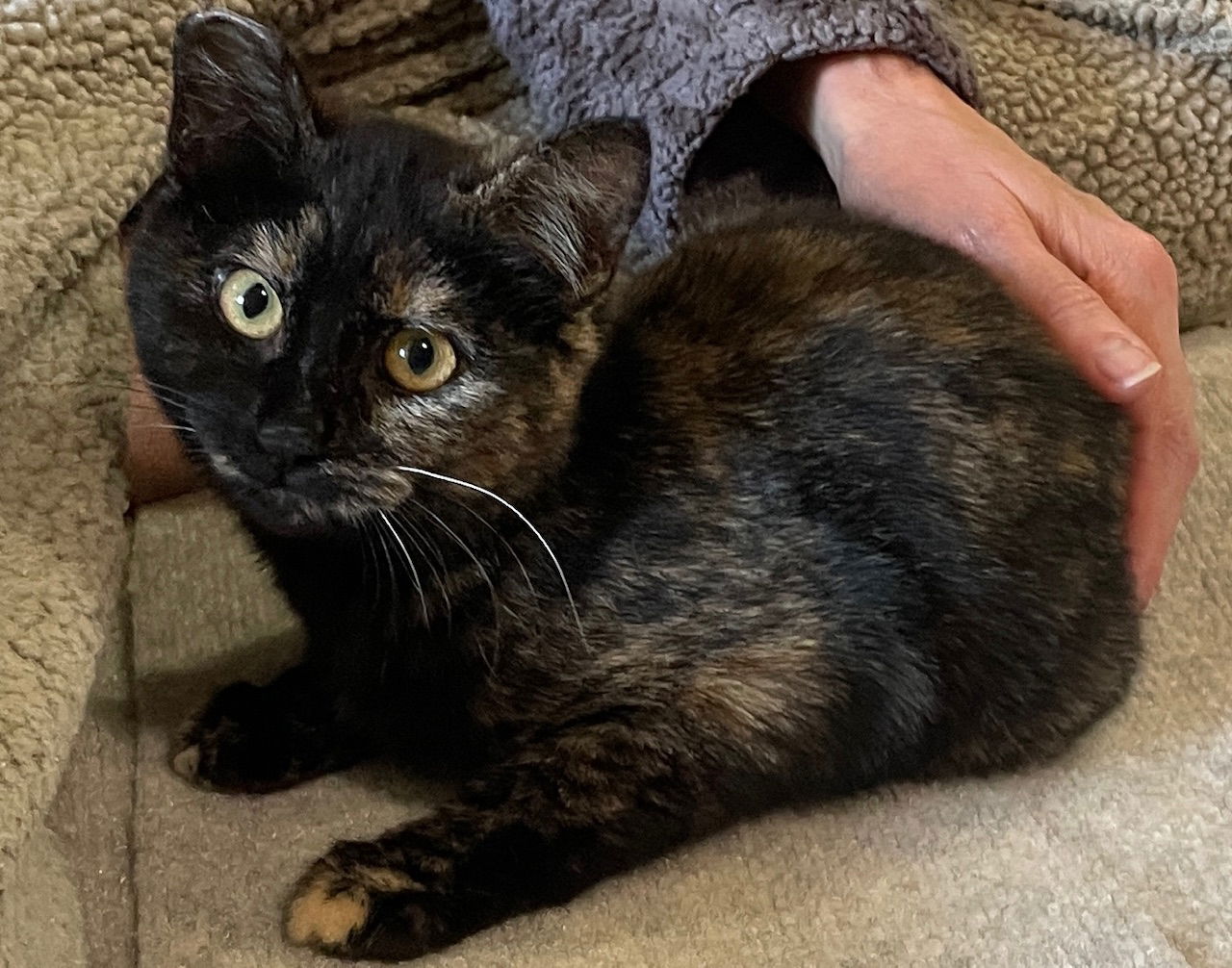 See Malina’s HomepageGo to our official websiteYou can fill out an adoption application online on our official website. Give our cats & kittens a loving, forever home, and let them put a smile on your face! Malina (born November 2024) is a sweet rescue kitty from a commercial farm. She loves to play and purrs when you touch her. She loves to follow her big brother Fozzy Bear (from a previous litter). He is so sweet with her. She also loves to romp with her buddy Benji. This little gal is still shy but is coming out of her shell and would love to rule the roost. She has beautiful butterscotch and black markings and mews so sweetly. Her shyness will require patience and calm and lots of playtime. She loves to play and pounce on feet under the covers. This little girl is a delight. To learn more, email socalpetrescue1@gmail.com
