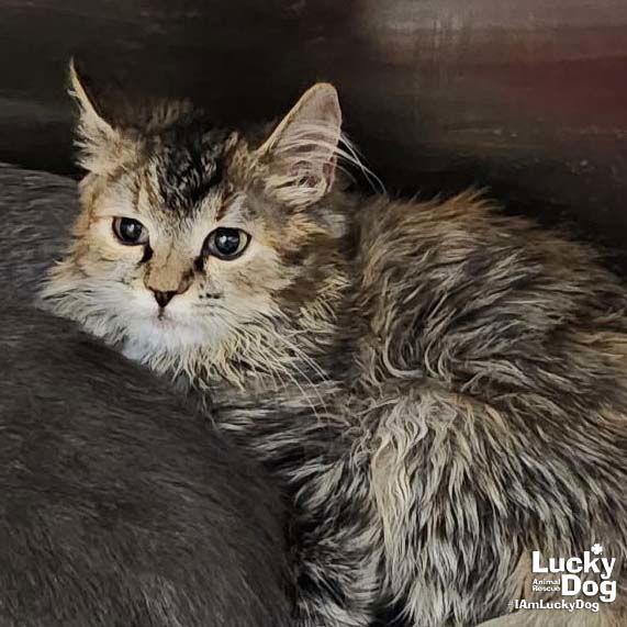 Please contact Mollie Gorney (mollieg@luckydoganimalrescue.org) for more information about this pet.Marilyn is in search of her forever home! MARILYN NEEDS A FOREVER HOME!!!! Name: Marilyn Best Guess for Breed: Domestic Long Hair Best Guess for Age: 16 weeks as of 1/16/25 (Est. DOB 9/20/24) SEX: Female Approximate Weight: 3.4 lbs as of 1/16/25 Coloring: Brown Tabby Type of Hair: Short Gets Along With: Because of her young age, Marilyn will likely get along with other cats, dogs and kids with an acclimation period. We’re happy to help with tips and tricks! Currently Living at: Shelter – coming to the DC area soon! I am Looking For: My loving forever family! Hi! I’m Marilyn, and I am a cute young girl! I won’t ask for much- just some love, cuddles and lots of toys so I can run and play and be myself. Litter/Lives With: Malvin, Marilyn, Marina What My Foster Says: Coming soon! TO ADOPT: The adoption fee for this kitten is $220 ($380 for two kittens adopted together), which includes the cost of routine vetting. If you are interested in adopting, please complete the Adoption Questionnaire online at bit.ly/adoptaluckycat Lucky Dog Animal Rescue does our best to provide accurate information about the cats we have for adoption. That said, we cannot make any guarantees about age, breed or temperament. Thank you for contacting Lucky Dog Animal Rescue and helping to save a life! Please visit us online at www.luckydoganimalrescue.org . BE A FOSTER!!! Fosters make it possible for Lucky Dog Animal Rescue to save and care for homeless and abandoned dogs! To learn about fostering, please contact fostering@luckydoganimalrescue.org BE A SPONSOR!!!! Sponsors help Lucky Dog support the many dogs we save. To learn more about sponsorship, please contact info@luckydoganimalrescue.org !