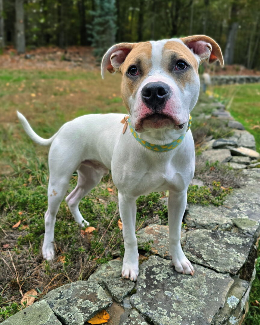 Meet Marky Mark! This 9-month old puppy has Good Vibrations to spare and came to us from a family who saved him from a bad situation. Sweet Marky Mark was passed around Boston for the first 5 months of his short life and finally given to a good Samaritan after sustaining a bite on the nose from another dog and developing an infection that his owner could not care for. This family made sure he received top-notch vet care and was committed to finding him a great home. Because of his lack of vaccine history, and an unknown history of the dog who bit him, Marky has been on a 4-month quarantine but is officially free and clear and is looking for love! He has been in a foster home with us since July, so we have really gotten to know him, and what an outgoing, friendly, ambitious, and energetic pup he is! Marky Mark is your typical puppy, with playful energy and a bit of a Wildside! He likes to fetch and catch, will hip-hop around the yard in zoomie fashion, loves his chew toys (especially benebones!), and loves playing with his foster sister. And at 42 lbs is such a great size! He has excellent manners and will bring one of his toys as a host offering to any houseguests who drop by. Besides being talented and gracious, this handsome youngster has stunningly good looks with gorgeous olive-colored eyes that make all the ladies swoon. Marky Mark is free-spirited and spunky, bright and joyful, clever and inquisitive. He is a happy guy and an eager beaver to please. And it never hurts that he likes any and all treats. He can be curiously apprehensive around new things, like mums or Halloween decorations that weren’t in the neighborhood on his last walk. It takes 3 times walking by, then he realizes they belong and ignores them. He is truly a Puppy for the People and would thrive in many different types of homes. It was rumored he lived with cats and recently did wonderfully by ignoring the cats in a home he visited for a day. He is 100% housebroken and quickly learned to ring the backdoor bells to let his fosters know he needs to go out. And he curls up to snuggle hard at the end of the night on the couch to watch TV. In fact, you will find him hanging out in whatever room his humans are in. Marky Mark just needs a Funky Bunch to call his own! Due to his lack of history, older kids would be best for this young star. Marky Mark’s top 3 priorities: 1. A family who appreciates cuddle time on the couch as much as he does! 2. A family who is committed to taking Marky to a basic manners class to continue to teach him good habits and make him into the best pup ever 3. An active family who wants to include this special man in their adventures on a walk or hike, or with dedicated playtime.