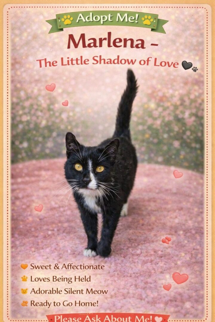 Marlena – The Little Shadow of Love . Meet Marlena, a gentle and affectionate girl with a heart full of love just waiting to share. This sweet tuxedo beauty may start off cozy in her cubby, but the moment she sees a friendly face, she can’t resist coming out to say hello and soak up some pets. Marlena truly enjoys being held and will happily lean into you for comfort and affection. One of her most charming little quirks is her adorable silent meow—she’ll “talk” to you in the quietest, cutest way that will absolutely melt your heart. She’s the kind of cat who forms a connection quickly—so much so that she even tried to follow along when it was time to leave the room. Marlena clearly knows what she wants… a loving home and someone to call her own. Sweet & affectionate. Loves being held. Adorable silent meow. Ready to go home and be loved. Marlena is more than ready to leave the shelter behind and become someone’s cherished companion. Could that someone be you? Please submit our no-obligation Adoption Application for a meet and greet or to adopt: https://forgottencats.org/adoption-application/. Not ready to adopt? Please consider fostering: https://forgottencats.org/foster-a-cat/. Thank you! (Foster: Trainer)