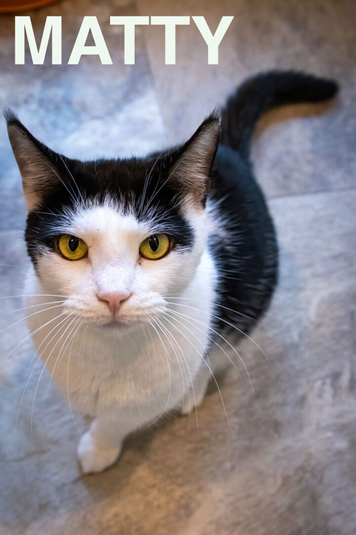 Cat-Friendly Lap Cat! Meet super friendly boy Matty! Introducing Matty, the dashing black-and-white boy who looks like he’s ready to take the stage with his perfect winged eyeliner! This handsome fella could easily be the lead singer of a rock band—excuse me, have you seen those striking eyes? But beyond his rock star looks, Matty is one of the most loving kitties you’ll ever meet. He’s always excited to greet you at the door with his wide-eyed charm and affectionate nature. Matty loves to be near his people, and he even has a quirky habit of sleeping under the covers! The other day, after feeding him, I couldn’t find him, only to discover him cozy and comfy, poking his head out from beneath the blanket as if to say, ‘I’m right here!’ If you’re looking for a handsome, loving kitty with a fun and playful side, Matty is your guy! Come meet this sweet boy today and let him rock your world with his charm and affection! Another volunteer said, ‘Look at that sweet face and his beautiful eyes! When I visited Matty, he was so excited to see me. He welcomed me immediately with lots of purrs and snuggles. He would love to be your new best friend!’ Matty is playing with is new foster family. Please submit our no-obligation Adoption Application for a meet and greet or to adopt: https://forgottencats.org/adoption-application/. Thank you! (Foster: Matt A.)