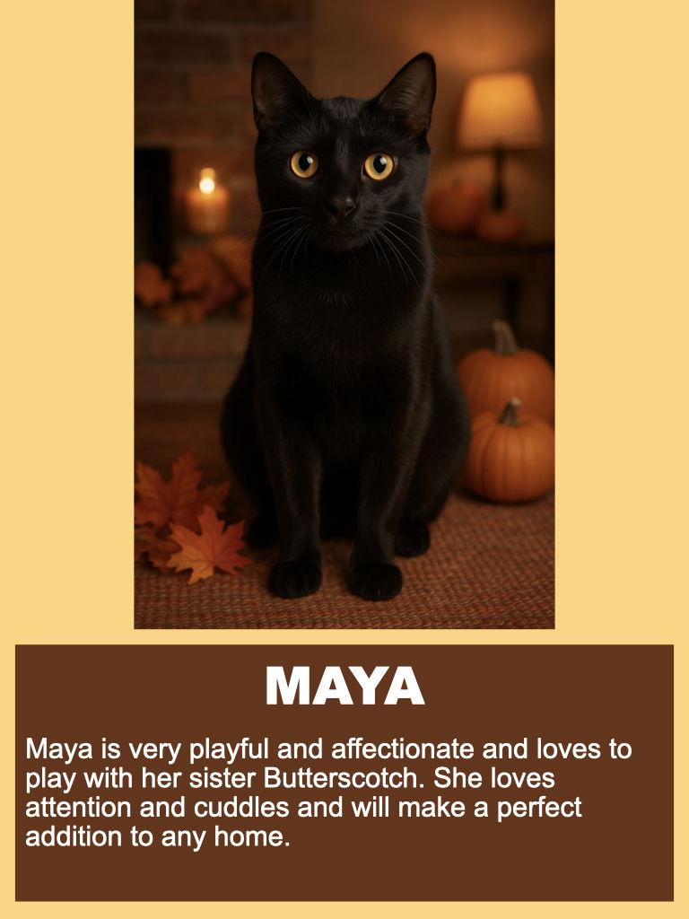 Please meet sweet Maya. Maya is very playful and affection and loves to play with her sister Butterscotch. She loves attention and cuddles and will make a purrfect addition to any home. Maya and her sister Butterscotch had been adopted but were returned due to allergies. Do you think that YOUR home would be perfect? Please stop into our Brookhaven PetSmart to find out! Please submit our no-obligation Adoption Application: https://forgottencats.org/adoption-application/. Not ready to adopt? Please consider fostering: https://forgottencats.org/foster-a-cat/. Thank you! (Foster: Trainer)