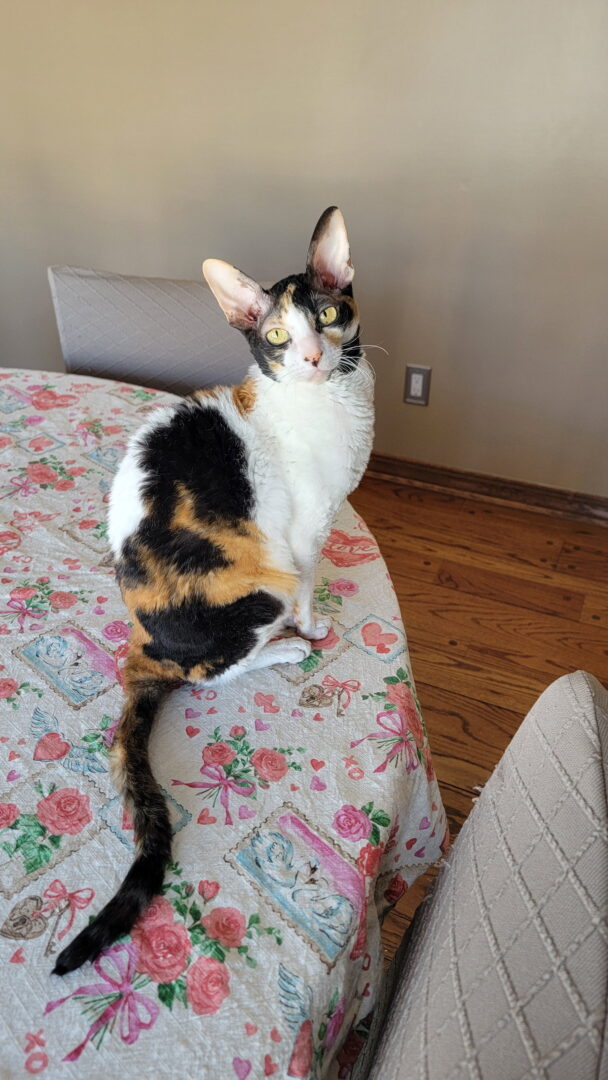 See Mazie’s HomepageGo to our official websiteMazie is a 6 year old purebred Cornish Rex who came to us when her owner could no longer care for her. Mazie is an active, affectionate girl with such a good personality! She needs to be involved in everything and likes to sit directly on your chest. She is quite the snuggler and will sleep in your bed with you like a human. Mazie is spayed, up to date on vaccines, and fiv/felv. Her recent bloodwork was very good. We had her visit a board-certified cardiologist due to her breed and she does have a mild, genetic form of HCM which is very common for the breed. She does not need medication at this time, but would need an annual echocardiogram to monitor her condition. Mazie has lived with other cats in her previous home, but she is not reacting well to the resident cats in her foster home, even after a few months of slow introductions. For this reason we believe she should be only cat, or can go home with one of the other Rex cats she came in with, but we are not requiring this. In-state adoptions only due to our return policy. Breed experience, HCM experience or vet-tech experience will be preferred. Please note that the Cornish Rex breed is temperature-sensitive, their curly, sheep-like coat requires regular brushing to distribute the oils, and regular ear cleaning. The coat does not get matted and there is very little shedding. To Apply, complete an application here: https://forms.gle/Tep1J4LTi12PjPuCA For questions, please email here: jerseyaws@gmail.com