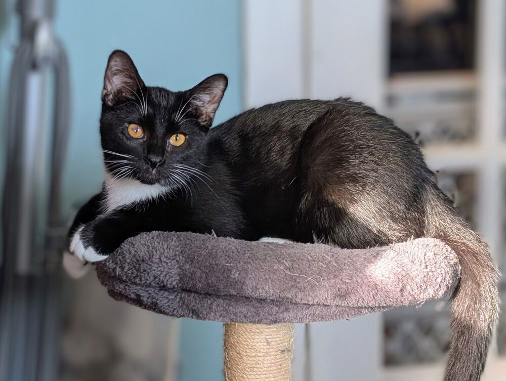 Melon is a stunning mostly-black male with just a splash of white and a lot of personality. This boy successfully fought a tough eye infection which left him with a tiny bit of scarring on one eye, but it doesn't affect him at all! He may be a little shy with people at first, but don’t let that fool you. Give Melon a tiny bit of time, and he’ll be your BFF for life. He adores sunbathing on the cat tree, indulging in wet food, and going wild for the Cat Dancer toy. He must be adopted with one of his siblings or into a home with another young, playful kitten to keep him company. One very cool and interesting thing about Melon is that he seems to like kids more than adults. He's like velcro to the thirteen year old in his foster home and much prefers she and her friends to adults! He would likely be just fine with a calm, respectful dog.Finally, Melon's paws are HUGE so we think he'll be a beautiful large cat, full of tuxedo cat energy. He's so cool!Melon is the perfect mix of playfulness and sweetness—if you’re looking for a kitten who’s uniquely beautiful inside and out, he’s your guy.Apply at online application (catsfff.org/adopt)View all of our adoptable cats here (catsfff.org/cats)Our adoption fees are listed here (catsfff.org/adoption-fees)