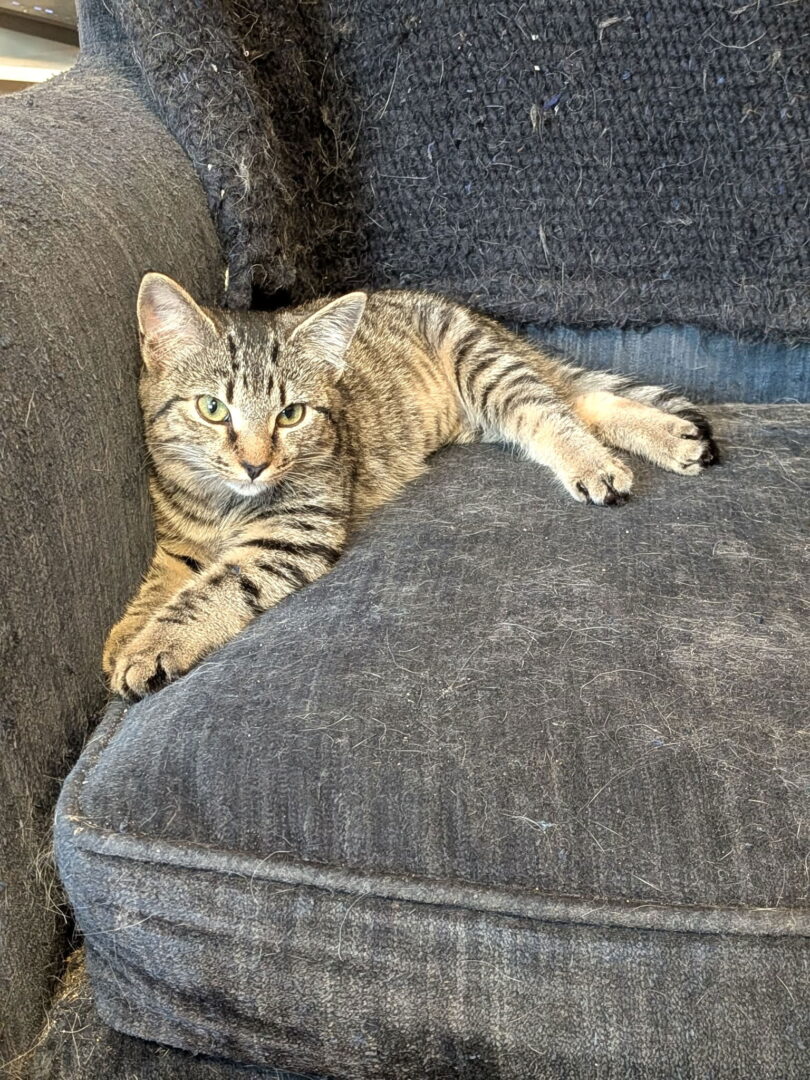 Hey there, I’m Meowtallica — the headliner of your lap and the stealthy guitarist of your heart. I’ll somehow end up exactly where you are, whether you like it or not, because personal space is my stage and your lap is front row. I’m playful, love hanging out with other cats, and I tolerate dogs (as long as they don’t steal the spotlight). Adopt me, and you’ll get a purr-fect mix of cuddles, mischief, and the occasional surprise headbutt — because let’s face it, I’m here to rock your world. Meowtallica =^..^=, DSH Brown Tabby, Female, DOB 7/12/2025 https://cataroundtownproject.org/adoption-application/