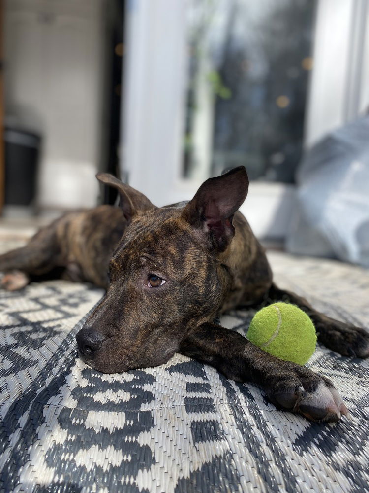 Meet Mercedes! This gorgeous brindle girl is playful, smart and funny! She can be a little timid at first, but once you earn her trust, she will make a great companion dog. She follows her foster mom around like a little shadow with no shortage of sloppy puppy kisses. Her absolute favorite thing to do is cuddle up on the couch—and certainly thinks she is a lap dogs. Mercedes is very good with other dogs. She does, however, exhibit a bit of a prey drive around chickens and cats, so probably best in a home without those! Mercedes is working on basic manners and commands. She has already mastered “sit” and is working on “leave it. She is very treat motivated which is always helpful for training. She is not a big fan of the crate but is doing wonderful with house training! Mercedes is a goofy, playful girl that love toys. Mercedes will be a great walking/running buddy. She went on a little boat ride w her fosters and she was super chill and easy going. She also loves playing fetch! Mercedes is very smart and highly trainable. She would thrive with an experienced owner who will devote the time, structure, and discipline she needs to be the best dog she can be! She is just waiting for her forever home.Applications can be filled out at www.piedmontanimalrescue.com/adopt! Petfinder and Adopt-A-Pet does NOT send us Applications. We receive many applications and many never respond after processing GREATLY delaying the pets forever home. Please only apply if you are serious about adopting. Please also make sure your pets are up to date on you species applicable Vaccines (rabies, Distemper/Parvo, FVRCP, Bordetella), spayed/neutered, and on Heartworm prevention if a canine. The adoption fee includes their age appropriate vaccinations(DA2PP and Bordetella), Dewormer, spay/neuter, microchip, heartworm test as well as the registration of their microchip information to you.The first step to adopting is to fill out an application for adoption. Once approved we will arrange a time for you to meet the animal you are interested in. If it is a match the adoption can then be completed and you can take home your new furry family member. If it is not a match we will file your approved application and you can wait till you find the perfect match.