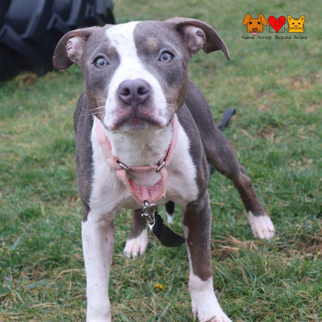 Surprise! It’s me, Meredith! Do you remember seeing a news story a few months ago about a bunch of emaciated pitties coming to the shelter as a strays? I am one of them! I have been a sweet, snuggly, secret while I had some medical things taken care of, and now the secret’s out….I’m ready to be adopted! I am full of fun, silly energy, and cuddly hugs. I am very affectionate, goofy, smart, and crazy! I love to play, zoom all around, pounce on toys, jump and dance, and everything in between. I am still a baby in so many ways, so I am looking for a family ready to help me grow, teach me new things, and share their life with me. Because of my background, not much is known about me really, except that I deserve a second chance at a happily ever after. Is it with you? Come meet me today!Few can resist a puppy. These adorable, soft bundles of energy are similar to four-legged children with tails. And like children, puppies need a lot of time, care, love, and patience. A puppy will depend on you for frequent and regular feedings and walks, for guidance and training, and for much of your time and your love. Before you plunge into puppy parenthood, make sure to research! There are many rewards to caring for a puppy, but there are also many requirements. Puppy classes are highly recommended for socialization and a positive transition into your home. Puppies love to learn how to be the best dog for your family!If this dog has been successful in our play groups it is not a guarantee that a dog will be social with other dogs in their home or in public settings. Dogs are individuals and have personality conflicts, just like us. Play groups do not guarantee that territorial or resource guarding issues will not surface in the home. While play groups do help us get to know the dog’s better, once they are adopted their new environments and new relationships will influence their behavior in ways we cannot predict.The Adoption Fee Includes:- initial canine distemper combination vaccination- first worming or stool check- rabies vaccination (for animals over 3 months of age)- 24 Petwatch microchipping- flea treatment/preventative- spaying or neutering-heartworm testingAdoption fee: $185.00Per state law, ALL ADOPTERS must purchase a non-refundable 2025 dog license at time of adoption for any canine three months and older. The cost of the license is $9.20. (Senior Citizen or Person with Disability-$7.20)All dog adoptions come with free leash and collar.