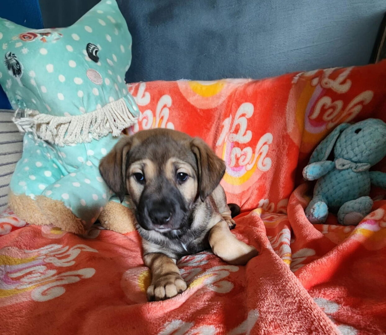 See Mesa’s HomepageGo to our official websiteYou can fill out an adoption application online on our official website. Mesa. We think German Shepherd/Cur and mastiff mix. She has beautiful coat coloring. Mesa is a sweet and sassy little pup that loves everyone. She is working on piddle pad training and doing well. Loves playing with toys and snuggling. Mesa has a big personality for a puppy and will make a great family dog. She will likely be a good size dog and will need lots of room and a yard to play in. Mesa is from a local reservation. If you are interested in getting to know this animal better, please fill out an adoption application. An adoption application is the best way to show your interest in an animal and is not a binding contract. To learn more about Ruff Start’s adoption process and the care our foster animals receive, please visit our How to Adopt page. *Rescue puppies are notorious for losing their birth certificates before entering our rescue. We cannot guarantee the breed or size they will be full grown.* If you are unable to adopt but want to help this animal and others in our care, you can donate to support the medical and veterinary needs of all Ruff Start Rescue animals.