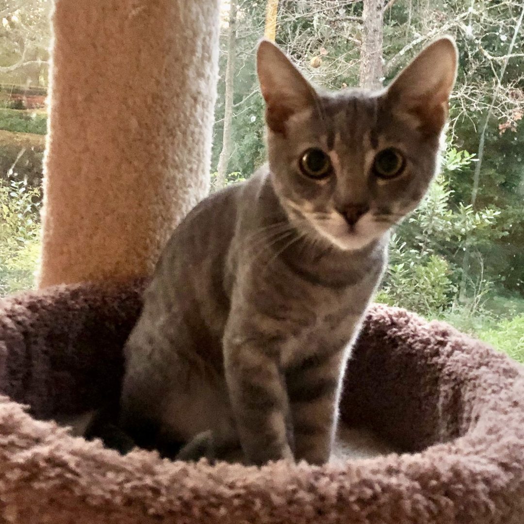 Please contact Helen (hmdoughty3@gmail.com), (925) 588-4867 for more information about this pet. Want to meet? [Fill out the Application], then email it to the contact in this bio. Born around September 1st, Midge is a sweet, well-socialized little lady with a playful spirit and a heart full of affection. This charming black tabby, with her unique ticked markings and sleek, glossy coat, is as striking as she is lovable. Midge has a special fondness for cozy spots and loves to burrow under blankets for her naps – a true snuggle expert! She’s petite in size but full of personality, and she’s always up for a game or a cuddle. She gets along beautifully with other cats and enjoys the company of playful youngsters, but she’s also independent enough to thrive as a solo companion. She also lives with a cattle-dog in her foster home. If you’re looking for a cuddly, curious, and absolutely adorable feline friend, Midge might just be the perfect match for you! If interested, contact Helen at (925) 282-0757 or hmdoughty3@gmail.com or meet kitty on Sat 1-4pm at Petfood Express in Walnut Creek.