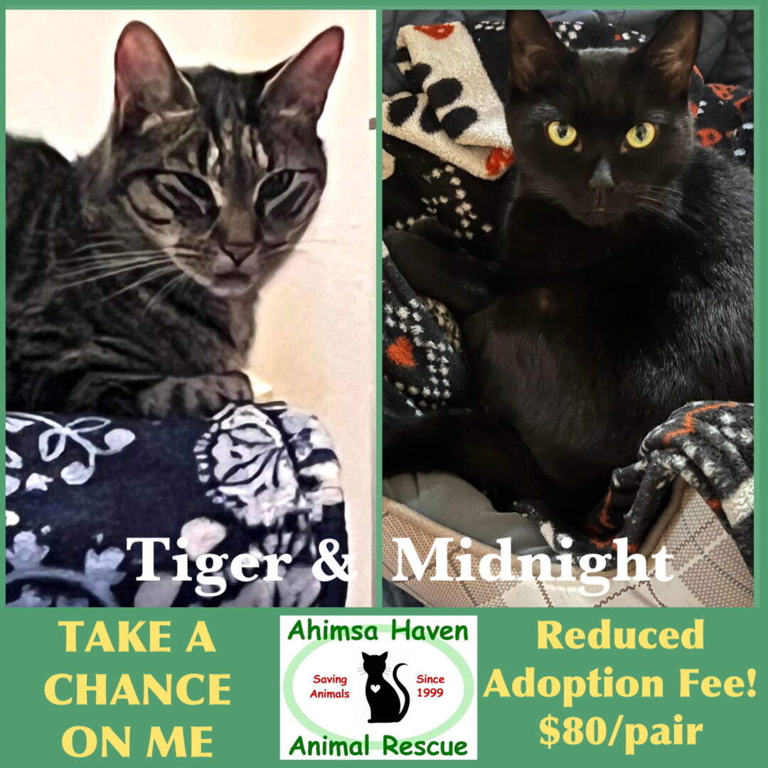Meet Midnight and Tiger! These sweet kitties are about 10 years old and lost their Mama and now need to find a new home. Midnight is female, very outgoing and loves attention. Tiger is a male and is a bit shy but will come to you and seek lovin as well in his own time. They are both playful and enjoy being with their people, they are great cats that would be fine with cats, dogs or children. They are also part of the Take A Chance On Me Program. This means my adoption fee has been reduced for the right home. If you are interested in adopting me, please fill put an application online at ahimsahaven.org . Meet and greets are with an approved application by appointment only. As always, cats that are ready to be adopted are spayed/neutered, have age appropriate shots, are micro-chipped, dewormed/deflead, and FEL/FIV tested.