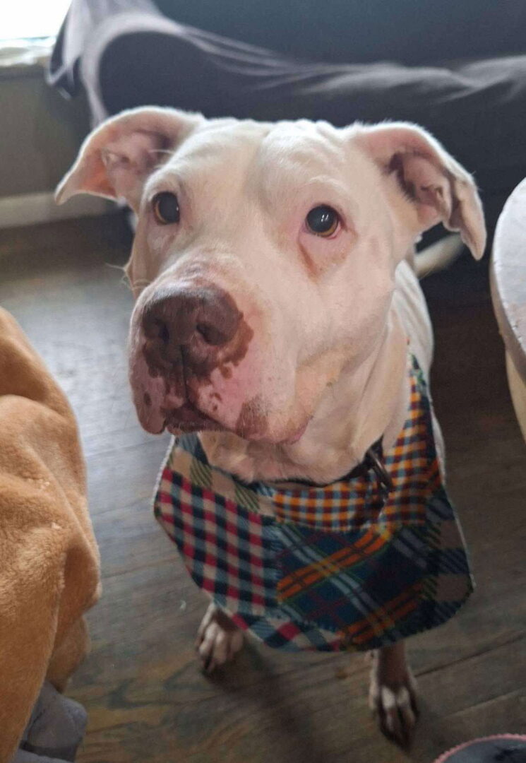 Meet Ms. Mila May, a sweet, beautiful senior white Pitbull who is approximately 11 years old and only weighs 50 pounds. We know that Mila had a rough life before coming to AAP and foster life. She likes everyone she meets, including children and will hang out with her dog buddies. Mila is a little too interested in cats, so would do best in a home without cats. Mila would like nothing better than to retire with her new forever family, that will love her unconditionally. She will happily binge watch TV and eat junk food with you. She is also will also happily sit through those long, boring conference calls, quietly snoozing away. Mila is not a fan of car rides but does like to take walks and meet new people. If you are looking for an easy companion, Mila May is your girl. If Mila's unconditional love and gratitude sounds like your perfect companion, please apply today! Her adoption fee is $200. She is up to date on age-appropriate vaccinations, spayed, and microchipped. Mila is part of our Senior Soulmates Program. If she is adopted by a senior citizen, a generous donor will sponsor her adoption fee and she will come with six months of heartworm prevention. All of our dogs are spayed or neutered, up to date on age appropriate vaccinations, microchipped and if over 6 months of age, heartworm tested and on heartworm preventative in their foster home. We require an approved application to meet any of our dogs. We do not have a shelter location and will not arrange a meeting without an approved application. We strive to make sure the bios provided for our dogs are complete and accurate; we do understand that mistakes happen, however, so if you absolutely cannot find the answer to your question in the dog's bio, you can contact us for more information. We require a home visit for each dog we adopt out, so we adopt within a 2 hour radius of Dayton, OH. If you are outside of this radius, we encourage you to contact your local rescue or shelter.