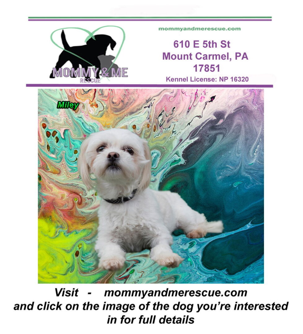 See Miley’s HomepageGo to our official websiteYou can fill out an adoption application online on our official website.All adopters are required to meet at our rescue center in Mt Carmel, PA (no exceptions). Please EMAIL all questions to rescue.me.pa@gmail.com Please fill out an application here > https://mommyandmerescue.com/adoption-application/ and give your vet clinic permission to speak with us. Spayed/Neutered, UTD on vaccines, Chipped Adoption fee 400.00 You must submit the application and be approved prior to meeting one of our dogs. If you have questions please EMAIL rescue.me.pa@gmail.com or visit mommyandmerescue.com Kennel License: NP 16320 Miley Maltese/Shih tzu Female DOB: 2/22/23 Weight: 7 pounds Miley is a sweet little girl and she loves other dogs. She is out-going and friendly. She would do ok with older kids that know she is just a little girl and they can’t be rough. Miley is pee pad trained and house-trained. Laps are her favorite place to be. License: NP 16320 PLEASE NOTE- we do not refund deposits if you change your mind. We are a PA licensed, 501C3 non-profit rescue. Visit our page for more information http://www.mommyandmerescue.com/
