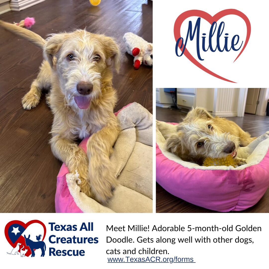 See Millie’s HomepageGo to our official website ♥️ Meet Millie! ♥️ This adorable, happy girl came to us from a rural shelter in Hill County, Texas, and she’s ready to steal your heart! Millie is full of puppy energy and absolutely loves everyone she meets, both human and furry friends alike. With her super soft, silky coat and unique look, we think she might be a Golden Doodle/Wheaten Terrier mix. Whatever her heritage, she’s 100% love and joy! Millie would thrive with an active family who can keep up with her playful spirit and give her a fur sibling to share her adventures with. If you’re ready to bring this sweet, bouncy pup into your home, we’re now accepting applications at texasacr.org. Let’s find Millie the perfect forever family! ♥️ We are a non-profit 501c3 Animal Rescue located in Dallas/Fort Worth, Texas. Our passion is centered around assisting animals that have been abandoned, neglected, or abused. We are a foster-based rescue consisting of 100% volunteers. If you are interested in becoming a foster, please email info@TexasACR.org