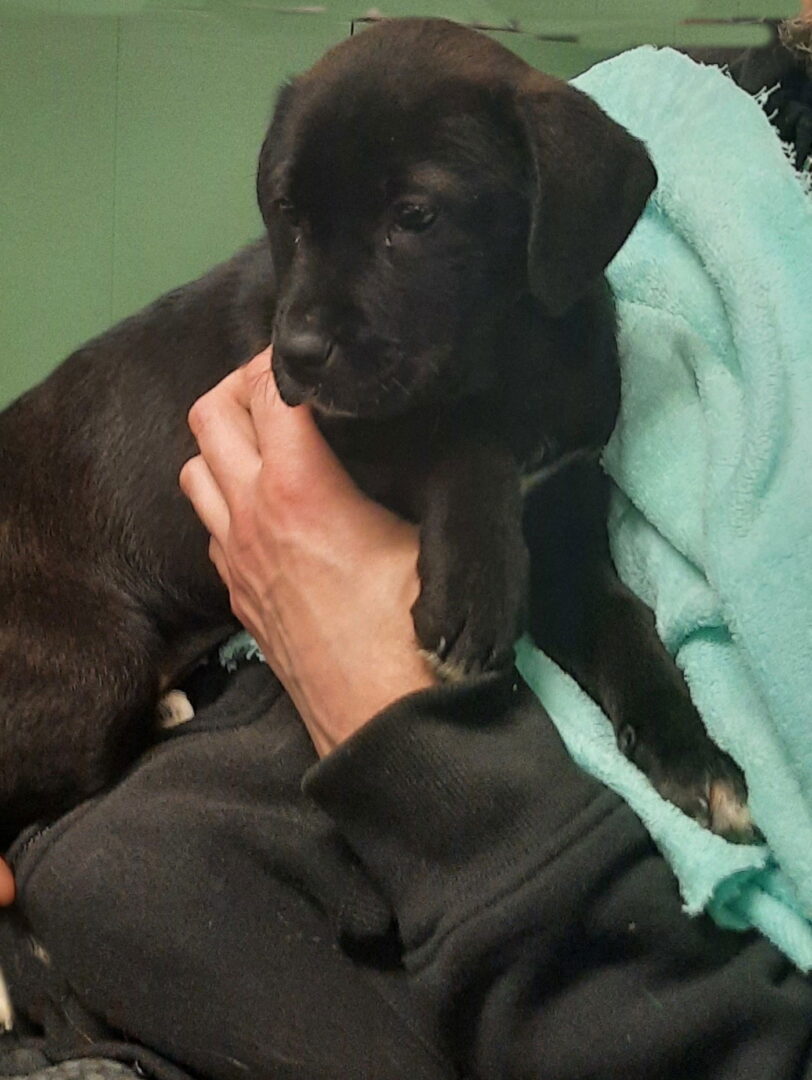 This baby is a mix of many, but guaranteed to be adorable. Expected adult weight about 40 pounds. Born in early January, very friendly, spayed, current on shots. Black coat with a little white at her throat and toes. Fee $200. Apply at morganspot.org.