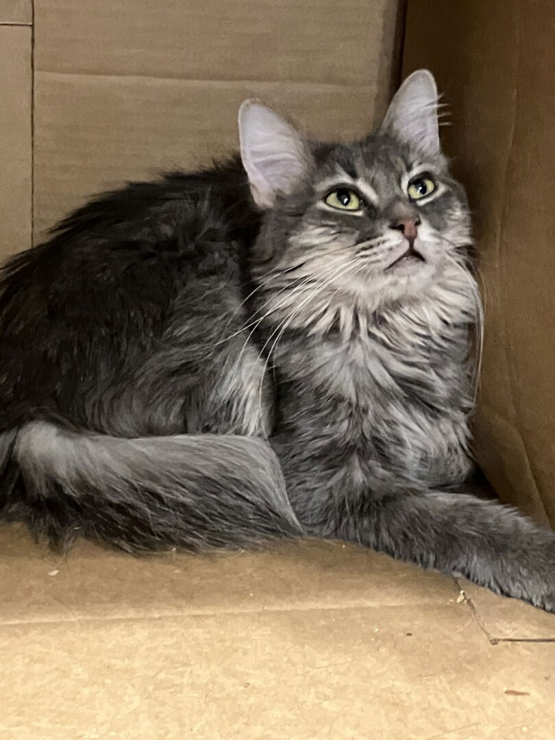 Mimic, like her sister Gusty, can be extremely shy, but once she warms up to you, she becomes an affectionate and playful companion. It could take days or even weeks though. Named after a My Little Pony character, Mimic will sleep on your bed, lay on you, and follow you around the house, seeking love and attention at every opportunity. She is a treat lover and enjoys canfood dinners. When she’s not being affectionate, Mimic is scaling cat trees and chasing after plastic coils (a required toy), jingle balls, and toy mice. She’s not ideal for those who prefer do not like "in-your-face" kitties. Mimic and Gusty are like two peas in a pod, so if you are looking for the perfect pair, they are it! She does require regular grooming due to her long hair and doesn’t tolerate dogs well, often being confrontational with them. Mimic would be best in a calm home with or without older children, where she can enjoy a peaceful environment without loud noises or sudden movements. No small animals like mice, hamsters or birds. She can be a door darter, so be aware of where she is when entering and exiting your home. She is spayed, tested, vaccinated, and microchipped. Her estimated birthdate is 6/1/2023, and her adoption fee is $140.