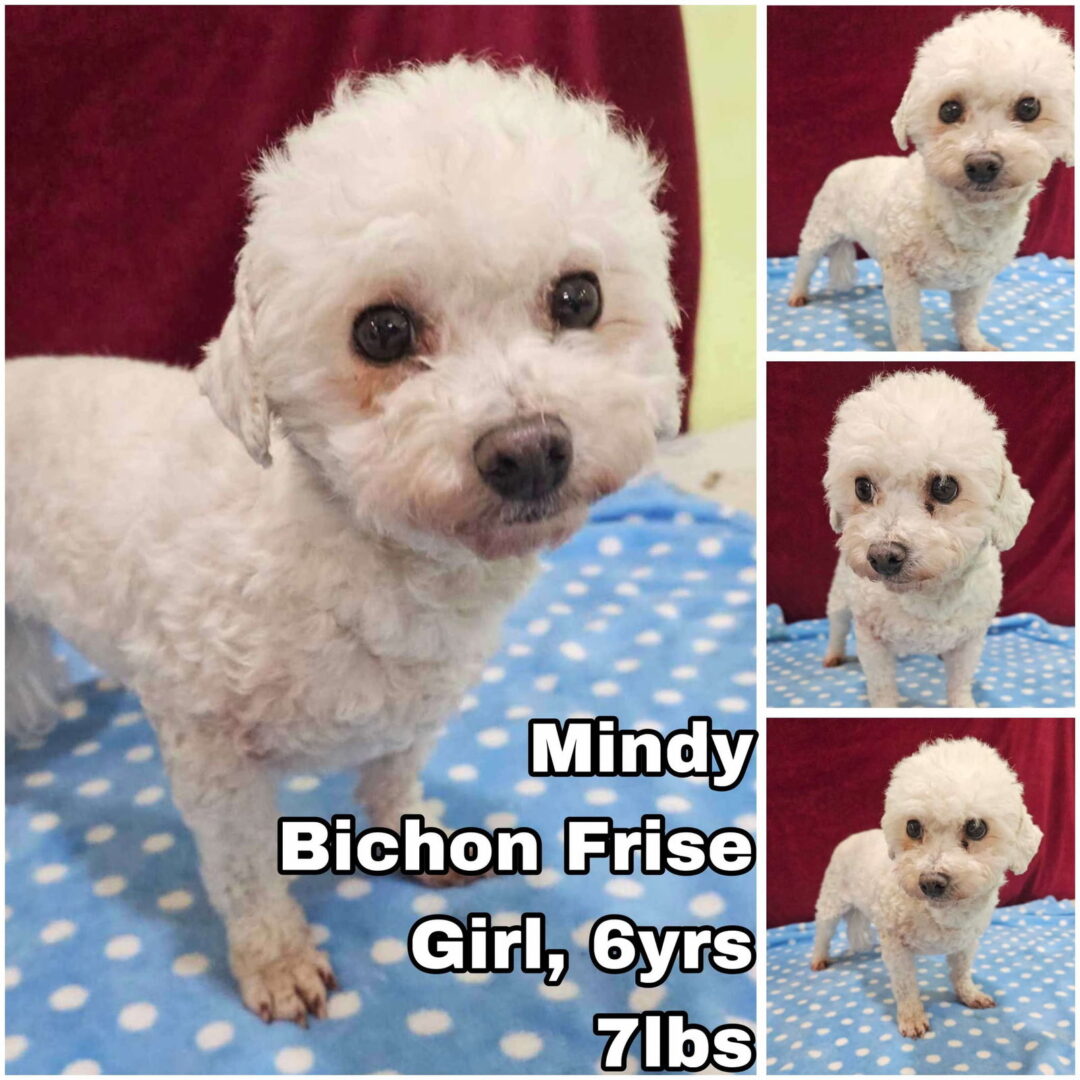 Click the button to download the adoption application. The application is a form-fillable pdf. Fill out the form, save it to your hard drive, then email back to sian@gingerspetrescue.org Hi, I’m Mindy! I’m a 6-year-old female Bichon Frise, weighing in at a dainty 7 lbs. Don’t let my small size fool you—I have a heart full of love and a personality that shines brighter than the sun. Life hasn’t always been easy for me. I was rescued from an illegal breeding farm in Korea, where I endured challenges no dog should ever face. Thankfully, kindhearted people stepped in and gave me a second chance at life. Now, I’m ready to leave my past behind and find a forever family to call my own. I’m a sweet, gentle girl who loves the simple pleasures of life—soft beds, warm cuddles, and quiet strolls with my favorite humans. I get along well with other dogs and would love a calm, loving home where I can feel safe and appreciated. Despite my past, I have a resilient spirit and a big heart that’s ready to embrace the love and care I know I deserve. I’m searching for a home that offers kindness, patience, and plenty of affection. As a rescued dog, I might need a little time to adjust to my new surroundings, but once I feel secure, I’ll shower you with loyalty and devotion. Working with our experienced pet rescue trainer can help make my transition smooth and successful. My adoption fee of $1,395 (tax-deductible and supports future rescues) includes Spay, DA2PP, Rabies, and Bordetella vaccinations, Deworming and Heartworm testing, Microchip, Boarding fees, health certificate and transport from Korea to Seattle. For my safety, all adopted dogs must have a GPS tracker or Apple AirTag. You can bring your own or purchase one from us. When you adopt me, you’re not just giving me a new beginning—you’re helping Ginger’s Pet Rescue save more dogs in need. As a 501(c)(3) nonprofit, your support provides critical care for countless animals awaiting their second chance. Email admin@gingerspetrescue.org to request an adoption application or to learn more about me. Donations to support veterinary care at Greenwood Vet are always appreciated and help make rescues like mine possible. If you’re looking for a sweet, loving companion who will bring joy to your life, I might just be the perfect match. Let’s start our journey together—I can’t wait to meet you!