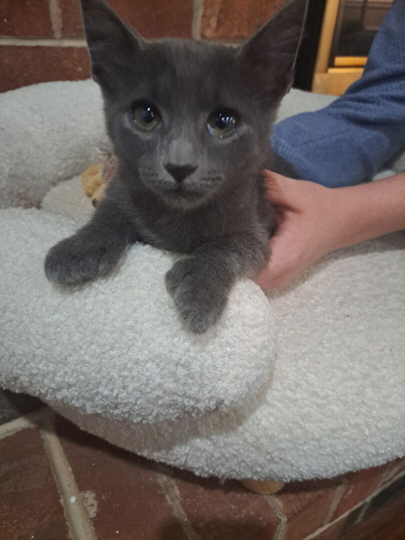 Mittens is an adorable, reserved, gray kitty. Mittens is the smallest kitten in her litter and is working on getting bigger and stronger each day. She really enjoys different types of spring toys, both traditional springs, and the more modern flicks/cone tubes. Like her sister, Mittens will most likely benefit from a quieter home. She is still learning to adjust to louder noises, even her foster family moving quickly around her can make her more on the reserved side. We think she would be fine around older children, if properly introduced. Mittens enjoys pets and cuddles, she just needs to warm up first. She likes to stay well hydrated and her first round of business in the morning is getting her H2O! She also enjoys a cat tower but does not feel it necessary to be on top of the tower. Mittens has been exposed to her siblings as well as three additional adult cats and she gets along well with all of them. She is beginning to wrestle more with her sister, and they do enjoy plenty of room for chasing each other around the house. She likes to hide under furniture, but peeks to see what is really happening. She is fast, and could be a flight risk if spooked so extra careful with this kitty! Mittens is true to her name- she has adorable gray mittens! Mittens is playing with her foster family. Please submit a no-obligation application for a meet and greet to adopt today: https://forgottencats.org/adoption-application/. (Foster: Michelle B.).