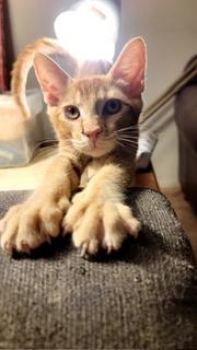 I am a little shy at first, but once I get to know you I am a complete lovebug. I will come up and rub my body on you and demand pets and lay in your lap. I am also very curious, and was the first one to get close to my foster family’s dog. I am okay with her, but I still keep an eye on her. I love being near my foster family and am very helpful with the yarn when my foster mom crochets and am always trying to taste test her food for her, even when she moves it away from me. I also get along great with my foster mom’s 15 year old cat. I’m not dirty in my photos, I have shades and spots of black on me because I was supposed to be a calico, but they ran out of ink. For more information & an online application go to https://www.cathouseonthekings.com/adoption/cat.php?id=27163&ts=1761721409&src=rg