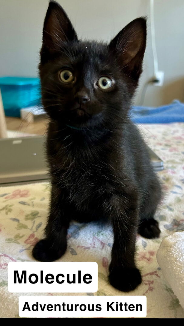 Molecule is a 10 week old black male kitten who is a little fluffier than his brothers. He is incredibly affectionate, and when he wants to be picked up, he will try climbing your leg to get your attention. Once he’s in your arms, he will reward you with a very loud purr. Molecule is a tidy, loving kitty and often can be found grooming his brothers. Molecule and his 3 brothers, Electron (FCID #03/25/25-126, adopted), Proton (FCID #03/25/25-128) and Neutron (FCID #03/25/25-129, adopted) have just moved from their foster home to the WG Petsmart adoption center. He would be happiest if adopted with one of his brothers or with another young kitten. Molecule is litter box trained, neutered, and up to date on his vaccines. He gets along well with children of all ages and with other cats. Although he hasn’t met a dog yet, he would likely be fine with a proper introduction. Molecule would be a wonderful addition to any family- how about yours? Molecule is playing at our Willow Grove PetSmart adoption center. Submit a no-obligation application to adopt today: https://forgottencats.org/adoption-application/ (Foster: Shirley G.).