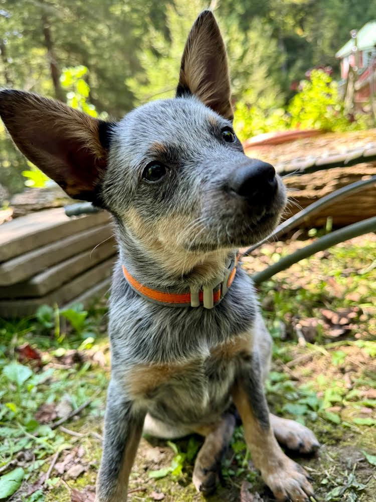 Location: WV Molly is a fun loving 16 weeks old puppy, born with 4 siblings who were all living in an outdoor shed in West Virginia. They are now safe with rescue organizations and Molly is ready to find her own family. She is a classic blue heeler with stand up ears, a white star on her head and a fierce, independent and loyal spirit just bursting at the seams. This confident and cuddly lady will keep life active and fun while showing you what it is to have the best friend in the world always at your heels or in your shadow. There are no dogs more loyal than these. She enjoys naps with her head on your legs and pressing up against you when you sleep. She is a charmer. Molly loves her food (making her very food motivated to help with training), but has quickly learned to gracefully wait her turn for after dinner treats with the three other house dogs. She enjoys her foster moms fenced acre exploring, digging, zooming, chasing, and especially climbing. If there are rocks, she will want to be at the top. Although in a rural area, she has been introduced to a variety of people, a few children, but no cats. She gets along well with her foster moms 3 dogs who range from 14 pounds to 110 pounds. These dogs are all older (9, 10 and 12) and really do not appreciate her activity levels. She has not been put off by them however and they are all slowly engaging in play with her. She is readily submissive if they complain. Molly was born on June 3, 2024. She has been dewormed, received her puppy vaccinations, tested negative for heart worm and has been spayed. She will receive her DA2PP booster after 10/16. A crate is used for her feedings only. She is working on house training, pretty consistently sleeps through the night without needing to potty, is learning leash manners and knows sit. Patience and diligence is needed in the car as she does get carsick. Her foster moms cattle dog also was carsick as a pup, grew out of it and loves car rides now. Molly would be a wonderful addition to any household. She wants to be with her people and looks forward to a forever home. Please contact artvicbeck@aol.com. Complete an Application: https://www.acdra.org/adoption-application
