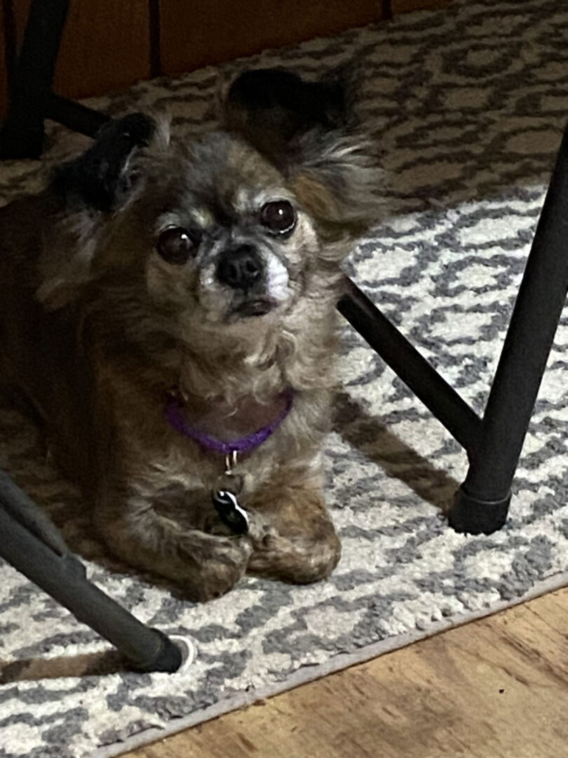 See Molly’s HomepageGo to our official websiteYou can fill out an adoption application online on our official website. Oh by gosh by golly, it's time to meet little Molly! Molly is a 6-year-old Chihuahua mix, possibly with Papillon. She has the trademark feathered ears like a Papillon, with a unique brindle coat. She is a little lady, about 6 pounds, and has a happy-go-lucky personality. She settled into her foster home within a few hours. She is truly a lap pet and will put her paws on you to let you know she wants your lap! Molly is also an active, inquisitive pup. She started exploring her foster home the minute her paws were on the floor. She also enjoys exploring the outdoors. We do not know anything about Molly's history, except she somehow ended up in a shelter in West Virginia. Despite whatever her past may have been, she is a friendly, quiet dog that seems to be comfortable within a home environment so it is likely she was a house dog. She is working on potty training, but needs retraining and consistency in this area. Molly has had her initial vaccines and a heartworm test. Her heartworm / lyme disease test was negative. She will be visiting a vet soon for a health check, rabies vaccine and microchip. She also needs to be spayed. Happy Days Dog and Cat Rescue microchips all dogs and cats before adoption. Microchips are implanted between the shoulder blades and are another form of identification should the animal get lost. The microchips are registered to Happy Days Dog and Cat Rescue. The adopter's information is added once the adoption is complete. The adopter is responsible for a $19.99/Year registration fee or a $45.00/Lifetime registration fee to change information. Dogs and Cats still need to have collar with tags should they get lost.
