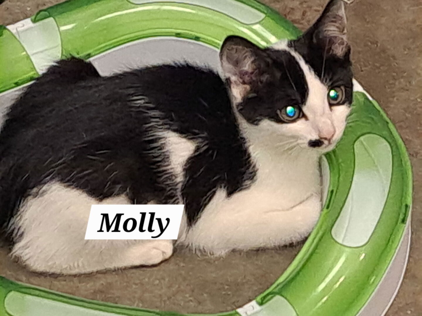 Please meet Molly! Molly says, ‘I love other kitties and well-behaved dogs. My sibs and I are your typical, crazy kittens. They love to entertain you with their shenanigans! All of us are cuddlers.’ Molly is a purr-baby that loves to sit on your shoulder. Arthur, Molly, Ginny, Fred and Ron are playing in our Brandywine PetSmart adoption center. Please stop in for some playtime! Please submit our no-obligation Adoption Application for a meet and greet or to adopt: https://forgottencats.org/adoption-application/. Thank you! (Foster: Kelly E.)