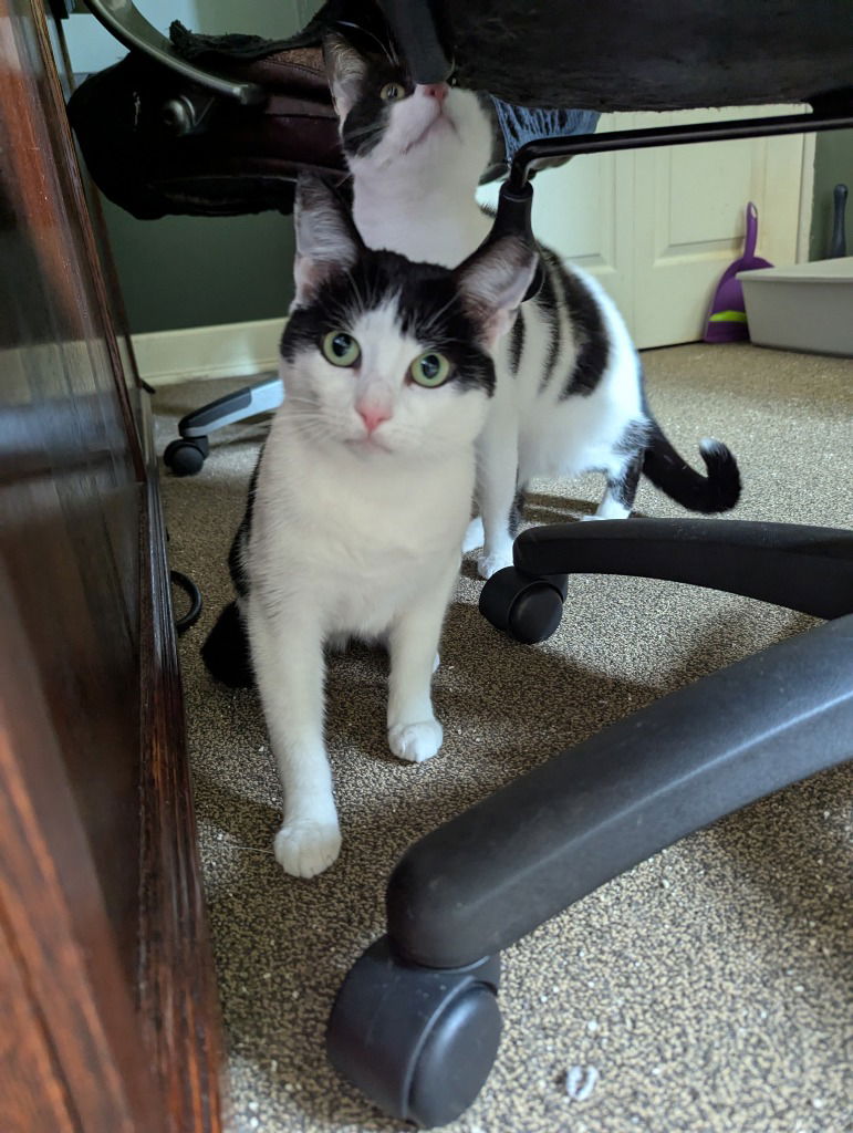 Mama cowgirl is/was a great mama. She had two litters before we captured her. She’s a timid yet sweet girl who raised her babies well. She is a little shy. She would most likely do best if she went with her son Penguin as they are bonded. Penguin is also shy, but does enjoy rubs and scratches where mama is a little more standoffish, but will come to you for food or treats and an occasional pet. She likes company and will sit near you. She’s playful and shows her belly. She’s often seen perched up in the cat tree, watching birds or grooming one of her last three sons. Apply for this kitty: https://rescuekitty.org/adoption/adoption-application
