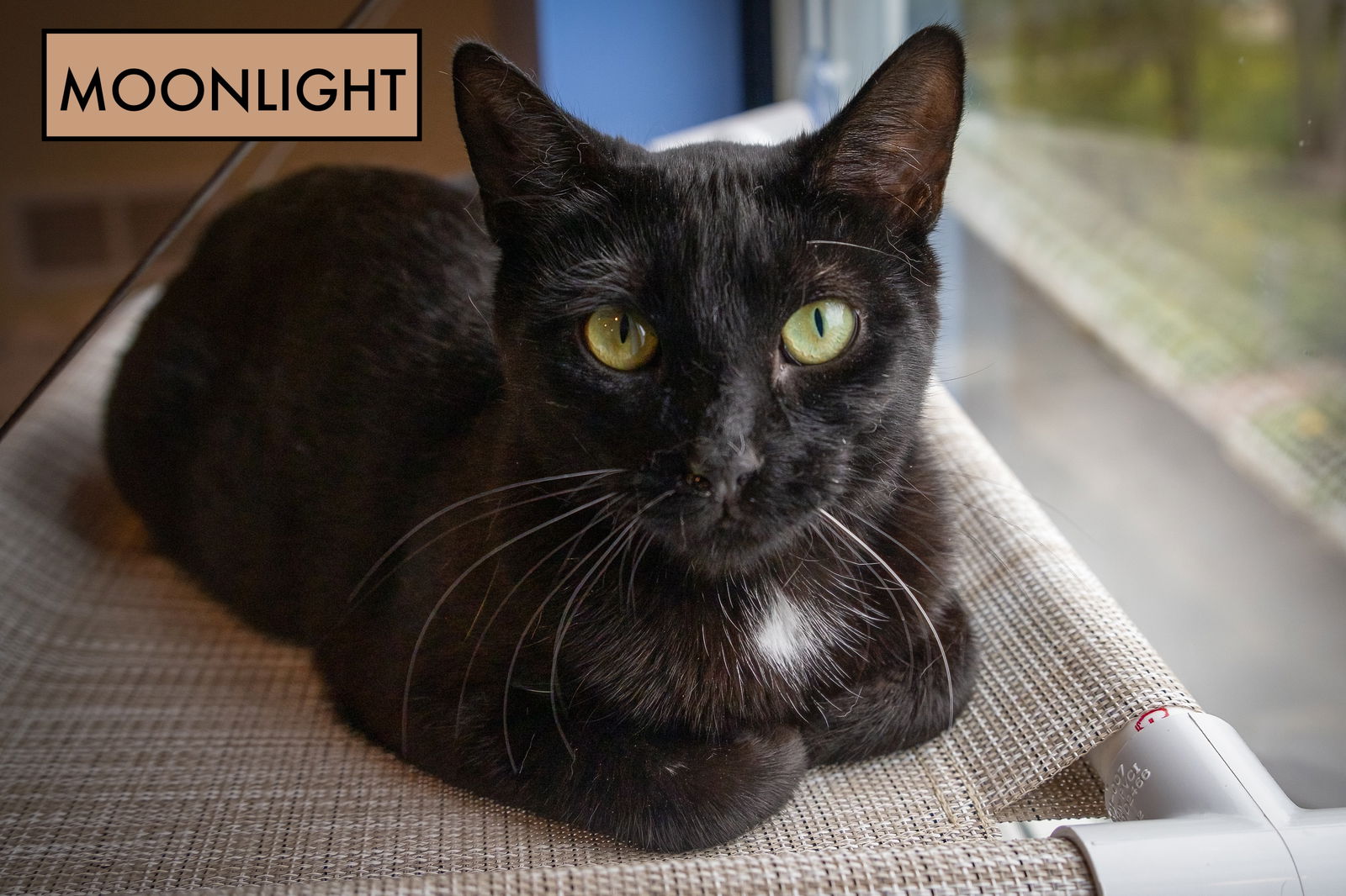 Aurelie, Stack and Moonlight are scheduled to arrive at our West Chester PetSmart adoption center on Oct. 24. This young girl is named Moonlight. She has a beautiful, sleek black coat and a white star on her chest. Plus, she has the cutest white whisker that you can catch glimpses of against her black fur. Moonlight is still adjusting to life in the shelter. She was glad to accept pets from me, her new human friend. But what she would really love is to have a home to call her own. In one photo, Moonlight is soaking up the sunshine with her new pal Selleck (FCID# 06/23/2025 – 13)! Please submit our no-obligation Adoption Application for a meet and greet or to adopt: https://forgottencats.org/adoption-application/. Not ready to adopt? Please consider fostering: https://forgottencats.org/foster-a-cat/. Thank you! (Foster: Trainer)