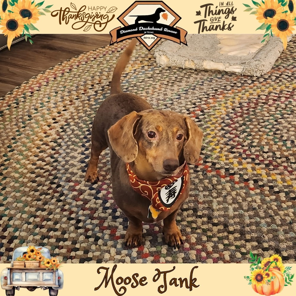 See Moose Tank’s HomepageGo to our official websiteWelcome to the Wonderful World of Rescue Dachshunds. Look around and read their bios. Find a few whose personality seems to fit well. Consider one of our Well Seasoned Seniors who are truly wonderful and have so much to offer. Need help finding the best fit? We'll help with that too. Please fill out an application and let’s get you all matched up with a loving new “furever’ companion and friend. You’ll find the application on the “Available Dogs” page. NOTE: Adoptions to Central/South Texas residents only Please see FAQs for current adoption fees. DDRTX only adopts in Central/South Texas. Email: ddrtxinfo@gmail.com Primary Website: www.DDRTX.org Moose Tank is a 3 year old chocolate dapple dachshund. He weighs 15 pounds. He came from a very loving home. He lived with another dog until his owner became sick and couldn't keep him. Moose is very sweet and a big time cuddle bug. Moose is very curious and absolutely LOVES to be where you are. He's super sweet and loves kisses and to be in any hook of his humans body. He is good with other dogs. He is housebroken, although he does submissive pee at times. He is crate trained. If you want a very sweet lovable dog, Moose is your guy! Love dachshunds and not ready to adopt or circumstances won't permit having a dog? How about being a sponsor or making a donation. Every one of our dachshunds receives excellent medical care along with day to day food, love and housing. Being non-profit, we rely on generous individuals like yourselves to help save these fur babies. You can do this specifically for one dog with the sponsor button on their webpage or a general donation on our “How To Help” page. Easy and quick through Pay Pal or your debit/credit card. You generosity is sincerely appreciated by all and is tax deductable. Need other ideas? You'll find tons of them on the How to Help tab. All contributions are tax deductable. Diamond Dachshund Rescue of Texas is a non-profit 501(c)(3) volunteer organization with focus on rescue and adoption of pure breed Dachshunds. All dogs are fully vetted and housed on private property. Meetings are scheduled upon adoption approval. Thank you for your continued support to the rescue and shelter communities! Opt to Adopt!